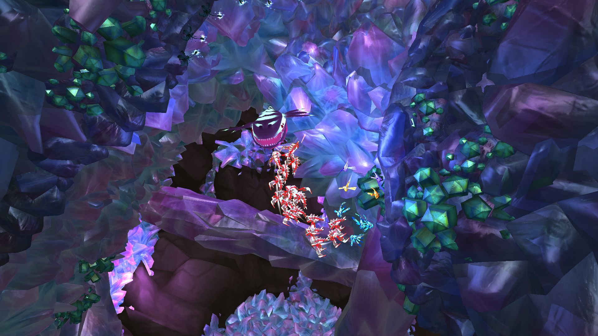 Si en otros lanzamientos la criatura va creciendo con la adquisición de alimento, en Lumini el concepto se basa más en manejar enjambres o bancos que pueden dividirse en grupos más pequeños. En general, por cuestiones prácticas –el control de varias criaturas se hace lioso al principio- y para evitar muertes innecesarias, lo normal es llevar al equipo compacto. Esta parte del juego consiste en navegar por el recorrido, no demasiado laberíntico, evitando los peces con púas, proyectiles y criaturas más grandes que acabarán con uno o dos integrantes de nuestro grupo a su contacto. Después de superar unos tramos encontraremos un extraño cubo que actúa de punto de control y canjeará los coleccionables por más peces.