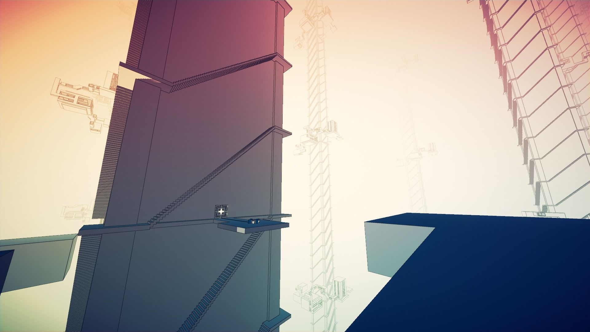 Al margen de los fallos que hemos comentados de cierta escasa variedad gráfica, maquillada un poco en su segunda mitad con la inversión de colores –negro predominante-, la verdad es que aprovecha bien un estilo minimalista donde los objetos lejanos apenas son siluetas monocolor, aparecen estructuras flotantes y edificaciones con patios hasta donde alcanza la vista. Ha conseguido una identidad visual con mínimos recursos, aunque no siempre acierte con su propósito de dar pistas al usuario de su próximo objetivo o el lugar en el que se encuentra. En el sonido, salvando unas situaciones concretas, la música es muy ambiental y poco intrusiva, válida para el juego pero no tanto para escuchar fuera de él.