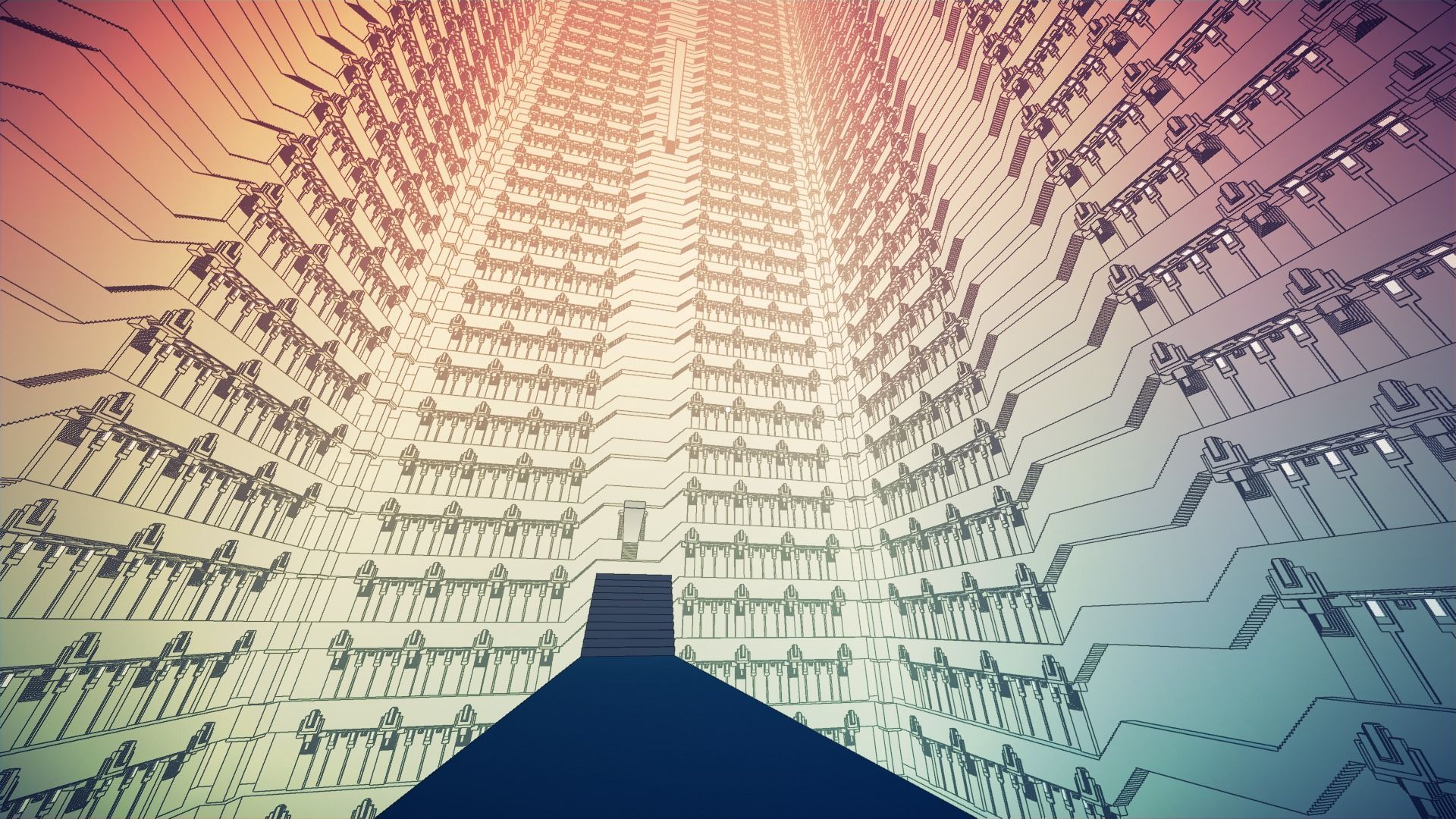 Otro de los inconvenientes que hemos sufrido con el juego es que tiende a marear mucho. Quienes sean sensibles al movimiento en juegos en primera persona quizás deban mantenerse a no menos de diez metros de Manifold Garden. La sensación se debe en parte a la monotonía visual, de líneas limpias y colores planos, y que si queremos jugar un poco rápido vamos a cambiar de plano en muchas ocasiones. La decoración habitual de estas zonas es un árbol cúbico, escaleras y poco más; después de poner el mundo del revés tres o cuatro veces, empezarás a echar en falta más referencias gráficas para orientarte; después de una sesión de una hora de juego agota.
