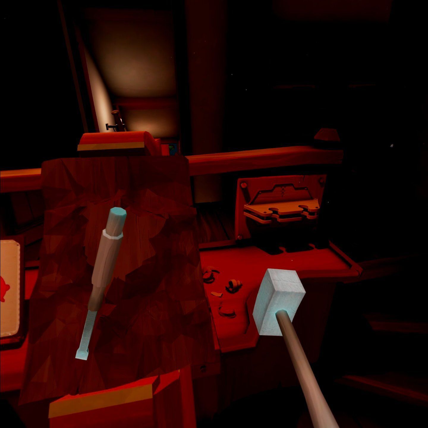 Todo esto cobra mucho más sentido en realidad virtual. Es un juego muy físico, en el que tenemos que interactuar constantemente con cosas, ya sea para coger los recursos necesarios para crear las máscaras, o para darle forma a estas. Queremos que quede claro que no es un juego de supervivencia ni de recolección de recursos; una vez encuentras el elemento adecuado, este está disponible de manera infinita en el taller.
