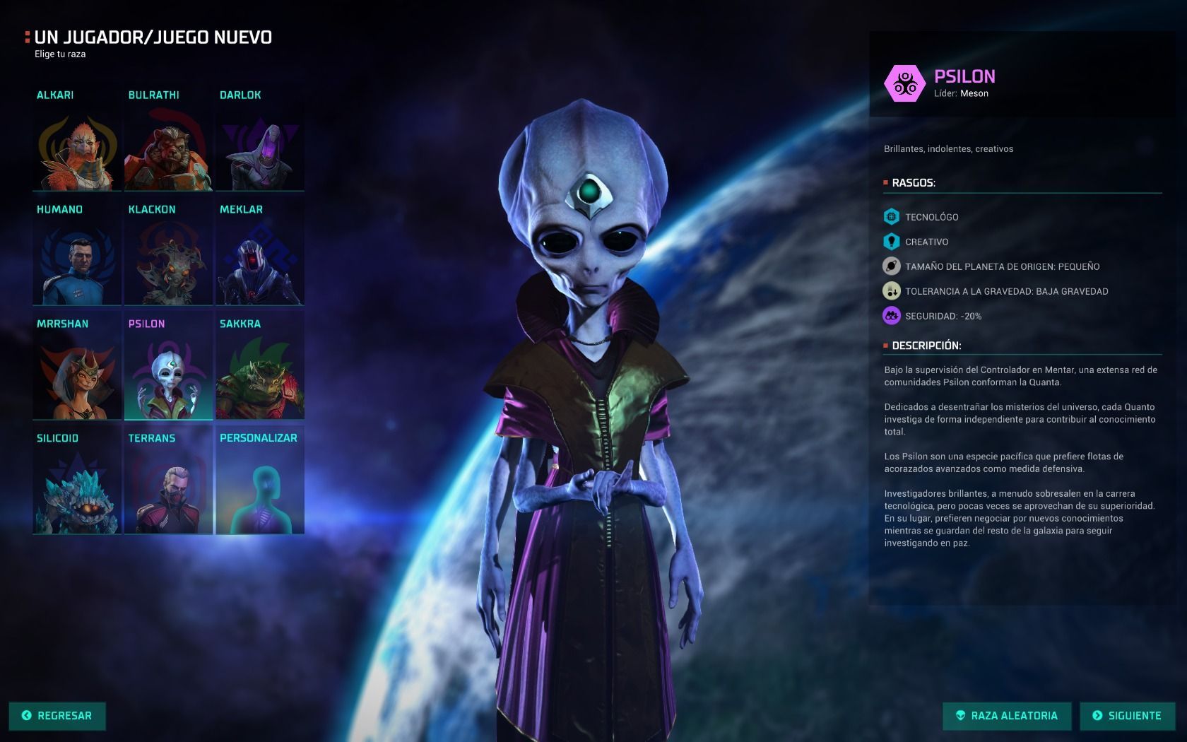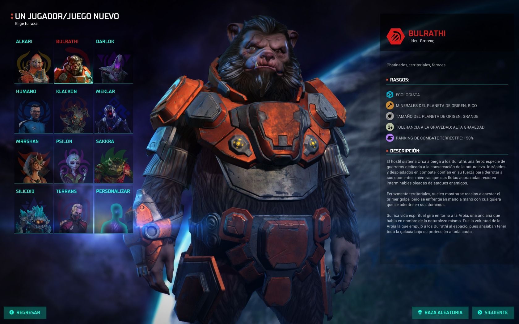 En el nuevo videojuego de Wargaming y NGD Studios se nos volverán a presentar las diez razas clásicas del título original. Diez facciones diferentes, con su propia idiosincracia que van desde los altivos hombres-pájaro alkari a los brutos y recios bulrathi, pasando por los humanos, los insectos del imperio klackon, o los tecnológicos meklar, los reptilianos sakkra o los felinos marrshan entre otros. La principal novedad es la inclusión de una facción disidente humana, los terrans, más belicosos y aguerridos. Como suele habitual -y aquí no os descubrimos nada nuevo-, cada facción tiene sus propias características, incorporando beneficios únicos y desventajas, que modificarán enormemente las vicisitudes y el desarrollo de la partida. En cualquier caso, y si en vistas del amplio catálogo de especies ninguna termina de gustarnos, siempre podemos jugárnosla a crear una desde cero, modificando determinados aspectos y parámetros en una compleja red de opciones que poco o nada tienen que envidiar a la de la creación de un personaje en un juego de rol de papel y lápiz, y en la que repartiremos y restaremos puntos al gusto.