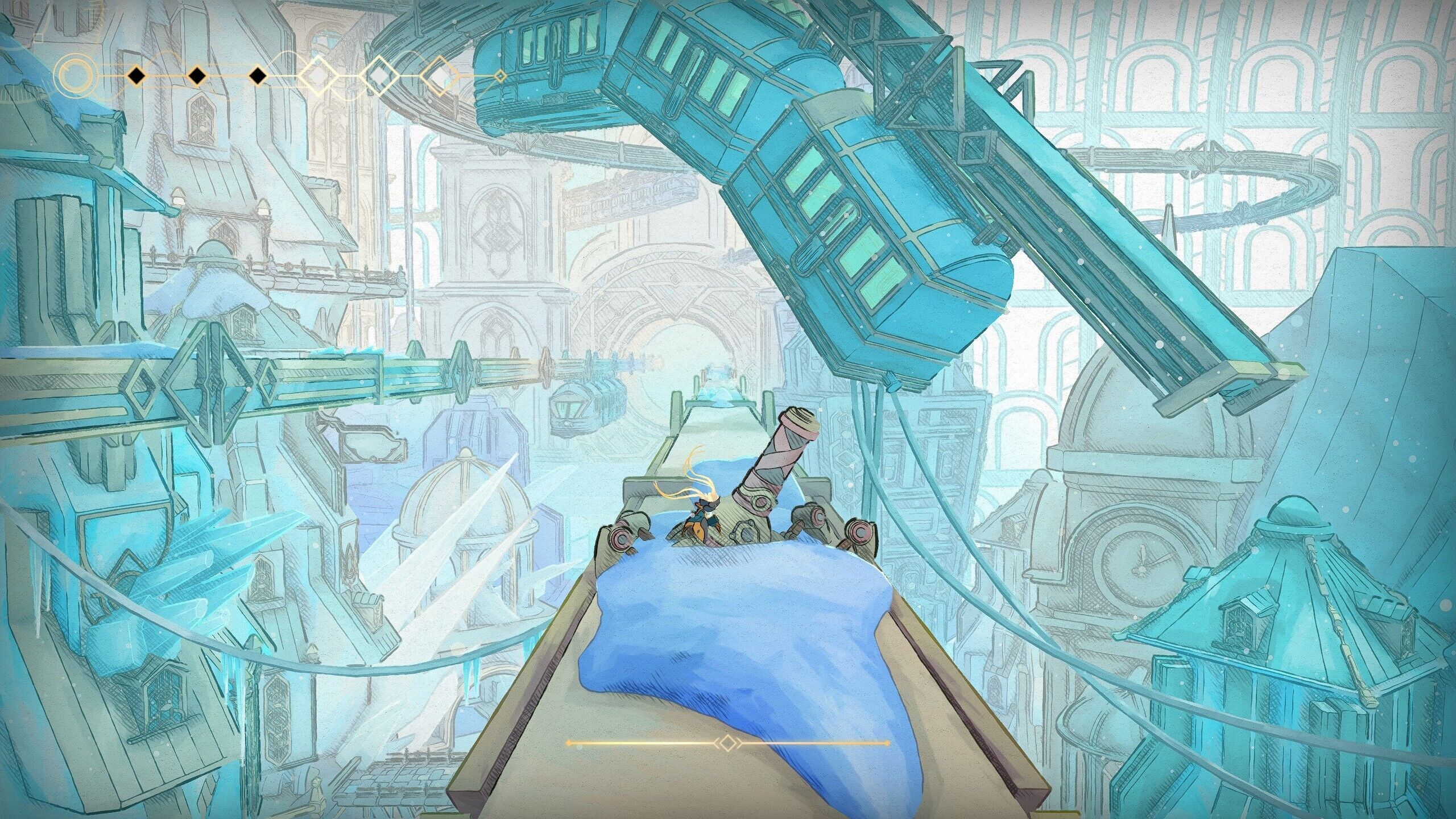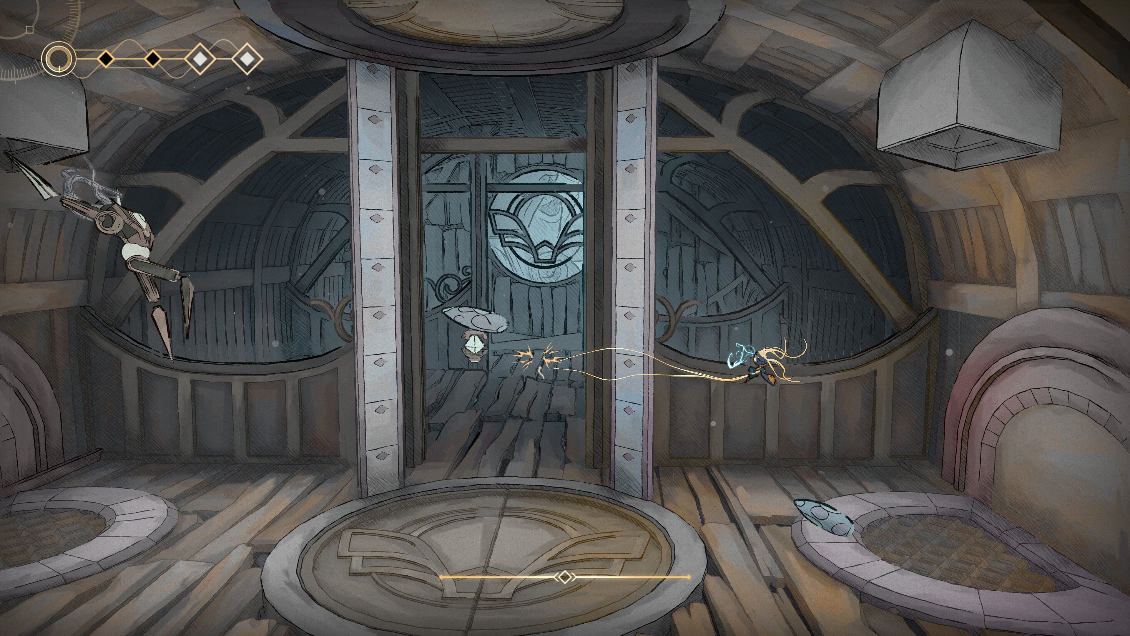 Incluso antes, la agilidad de la pequeña y poco resistente androide es su principal virtud. Se desliza con soltura por superficies heladas, se impulsa al engancharse en artefactos sobre los que después puede rebotar y tiene margen para dar el segundo brinco en el doble salto. Su limitación está en una barra de energía, que se gasta parcialmente al usar unas habilidades y totalmente al utilizar otras. Es un indicador que acabamos interiorizando hasta el punto de que su presencia en pantalla poco importa, y que conforme ganamos en pericia y precisión, nos da alas para superar obstáculos que parecían imposibles y para combatir enemigos aéreos sin tocar el suelo.