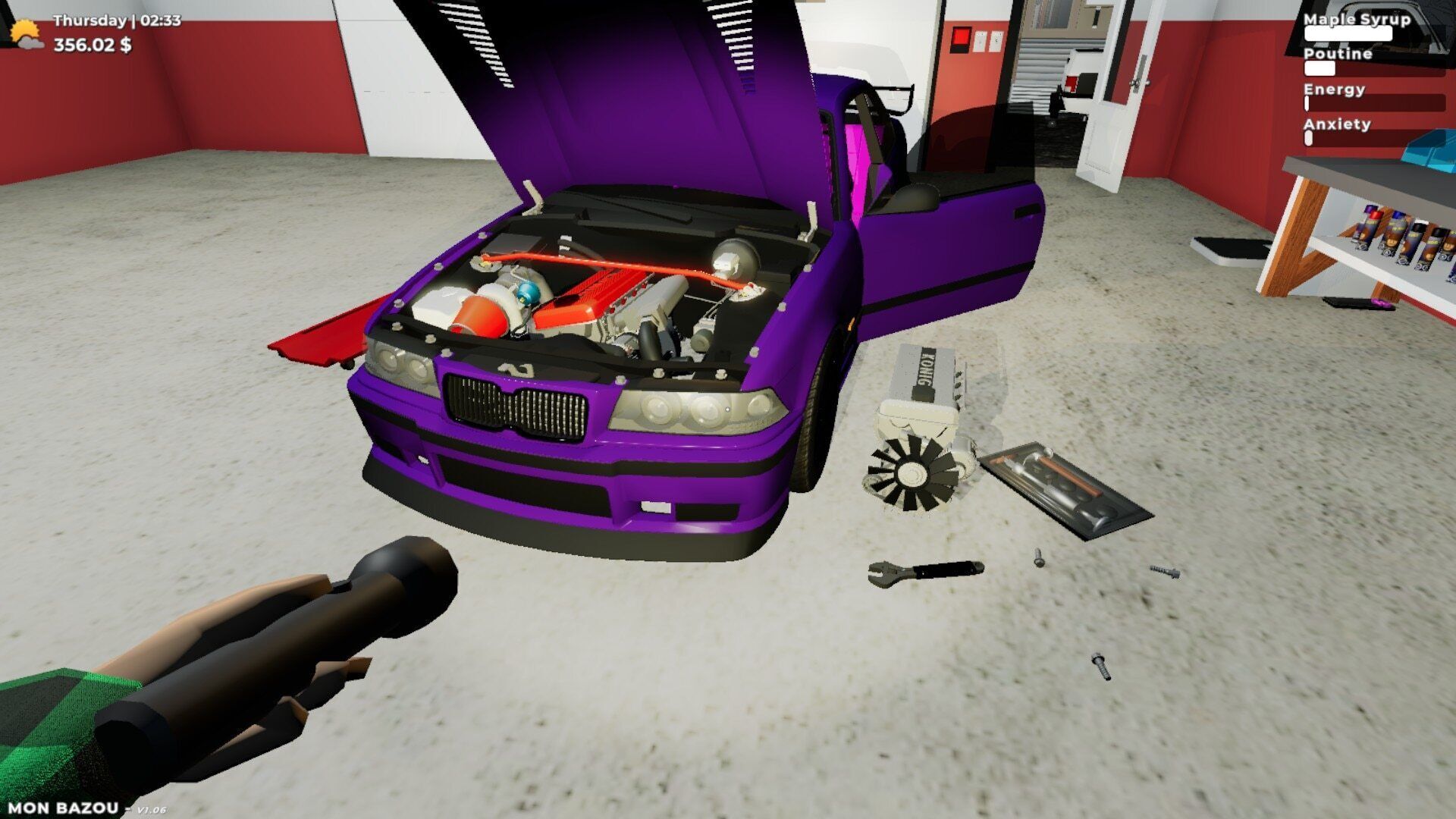 Mon Bazou es un juego relativamente difícil de explicar. Ofrece una gran cantidad de cosas por hacer: desde cortar madera, fabricar jarabe de arce, entregar pizzas o cultivar cannabis hasta construir tu propio garaje y modificar tus vehículos para carreras o simplemente para desplazarte por el mapa. La variedad de actividades y la constante evolución de tus máquinas es lo que mantiene enganchados a los jugadores. Gran parte del encanto radica en ese ciclo de progreso: trabajas duro para ganar dinero, inviertes en mejores herramientas o piezas para tu coche, y luego vuelves al trabajo con una eficiencia mucho mayor.