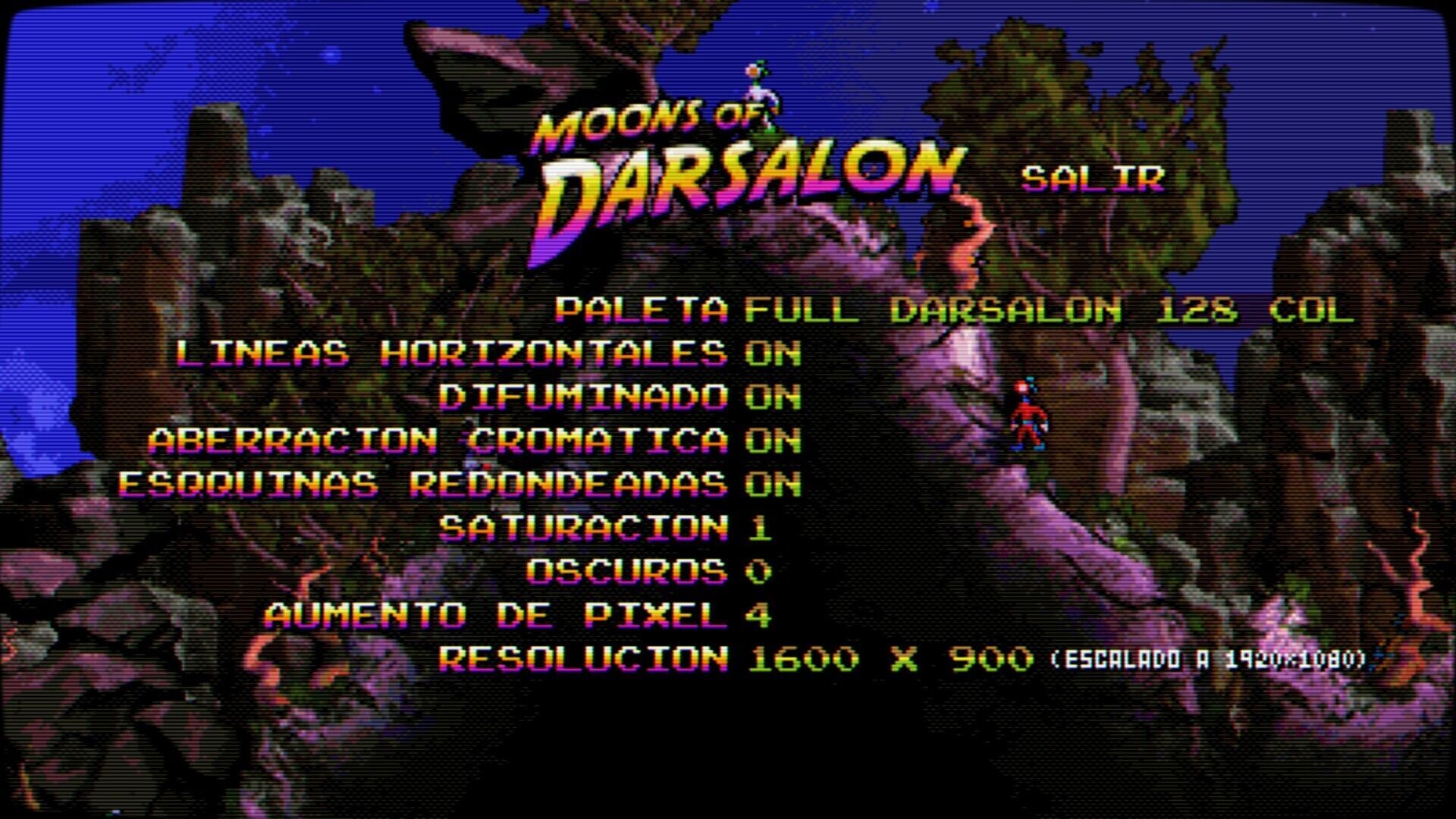 Moons of Darsalon no funciona con las limitaciones de un Commodore 64 –debajo del capó hay iluminación dinámica, físicas realistas en objetos y líquidos, mezcla de sprites y modelados 3D- aunque su imagen nos recordará inmediatamente a los juegos 2D de mediados de los 90, sobre todo aquellos que empezaban a utilizar gráficos prerrenderizados en sus escenarios. Para completar la inspiración, la paleta, uso de tramas y los diferentes efectos gráficos aumentarán la sensación de estar jugando en una pantalla CRT, pero naturalmente incluye una serie de opciones para ajustar o eliminar la distorsión, la aberración cromática y líneas horizontales si lo consideramos "demasiado" retro.