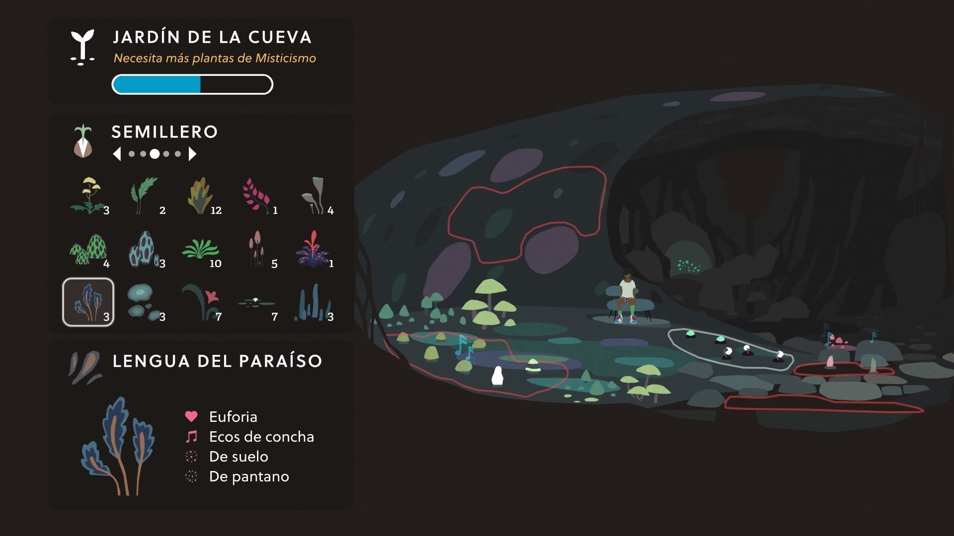 Cada semilla tiene características diferentes y se plantan en los jardines que Kai debe crear y que son la parte más interactiva del juego. Algunas se pueden cultivar en el suelo, pero otras necesitan agua o son de pared, y en todas hay que tener en cuenta el espacio que necesitan para desarrollarse completamente. Hay especies que es obligatorio sembrar por las misiones que nos van encargando, pero podemos decidir libremente qué plantará Kai en la mayoría del terreno. Después hay que hacerlas crecer interpretando con un pequeño tambor la melodía adecuada para cada tipo de semilla. Como todo en Mutazione, los ratos de jardinería son pequeños momentos para el placer tranquilo, para disfrutar de la canción y dedicarse, literalmente, a ver cómo crecen las plantas.