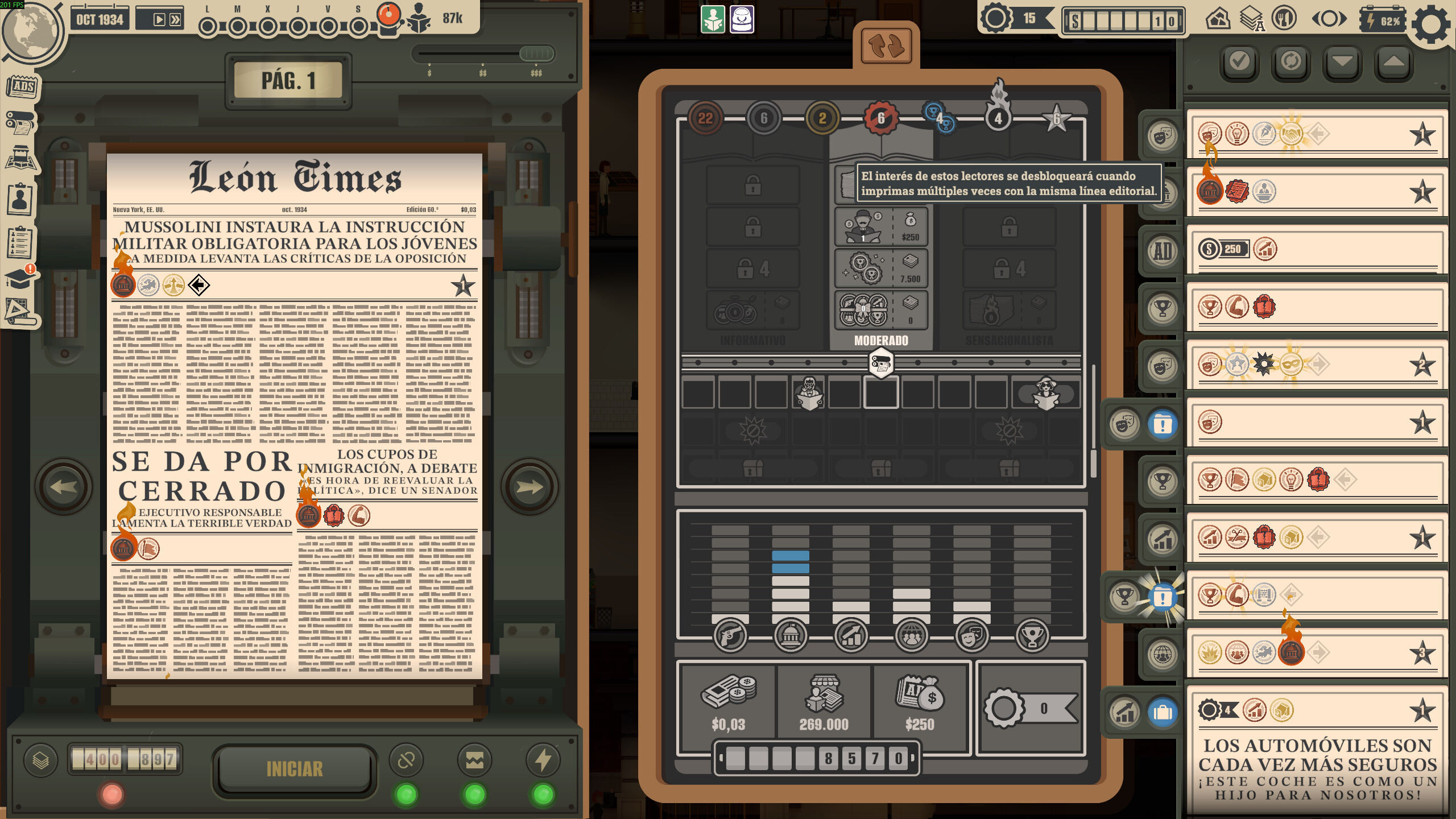 Sin embargo, no podemos ignorar que en la rotativa hay engranajes que aún chirrían. La dependencia del azar para contentar algunos objetivos de las facciones, la caducidad acelerada de las noticias y una interfaz que se vuelve algo tosca en las fases más avanzadas, son barreras que pueden empañar la diversión para algunos jugadores. Afortunadamente, la base es tan sólida y la satisfacción de ver nuestro periódico impreso es tal, que es fácil perdonarle estos deslices... y además robarnos horas de vida se le ha dado fantásticamente bien así que, poco más podemos pedirle.