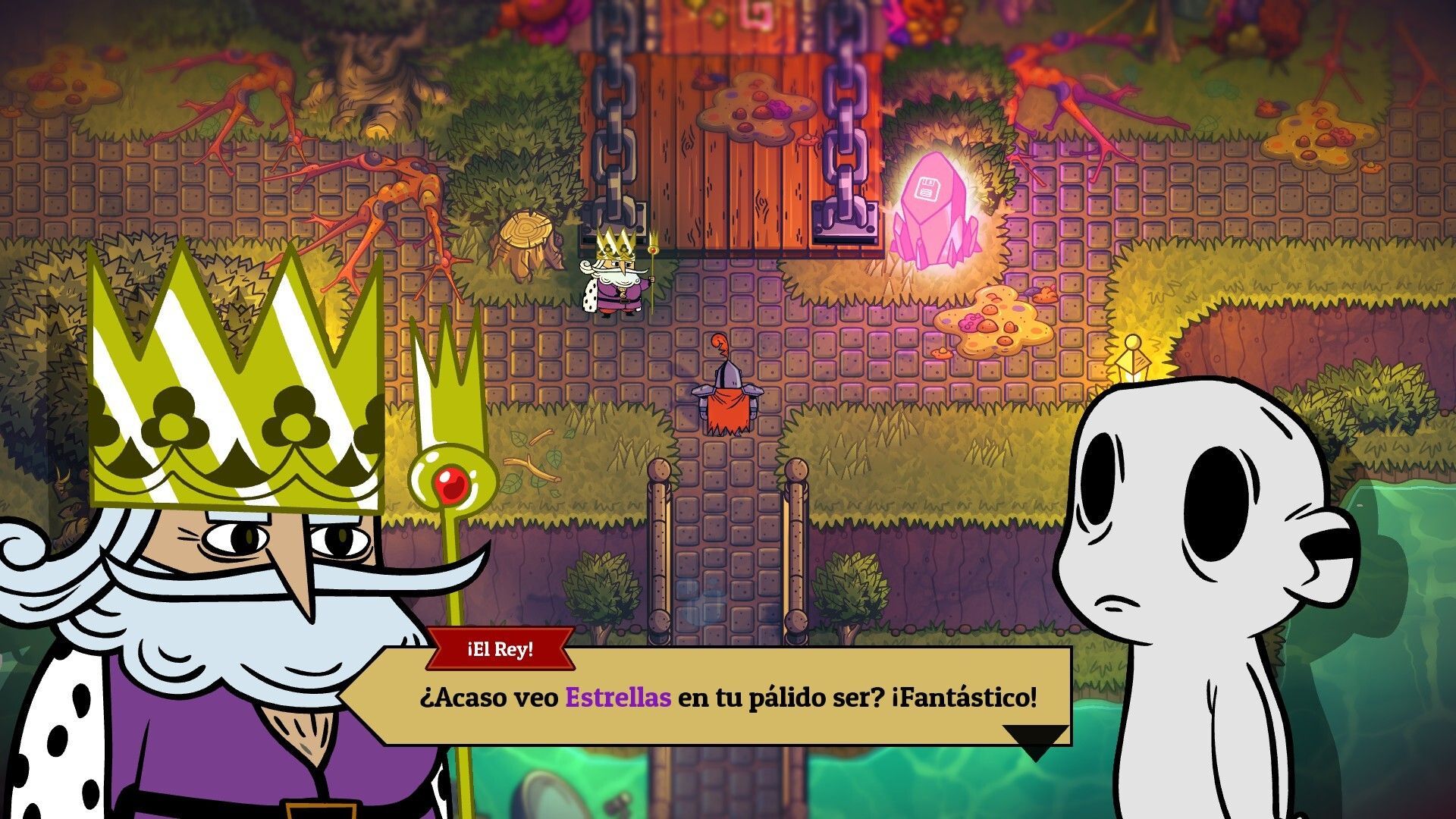 Nobody Saves the World incluye algunas barreras que requieren un determinado número de estrellas, o misiones superadas, que nos obligarán a que no dejemos de lado la lista de tareas. Esto nos lleva a hablar del desarrollo general del juego, que sigue un planteamiento similar al de las aventuras clásicas: explorar un mundo semiabierto –las restricciones vienen por esas barreras naturales o de puertas- donde diferentes personajes nos darán pistas del próximo encargo o servirán de comerciantes. Este mapa está diseñado por DrinkBox Studios y tiene todo lo que podríamos esperar de un Zelda o similar: bosques, algunas bifurcaciones, enemigos y tesoros para quienes se atrevan a investigar cada rincón.