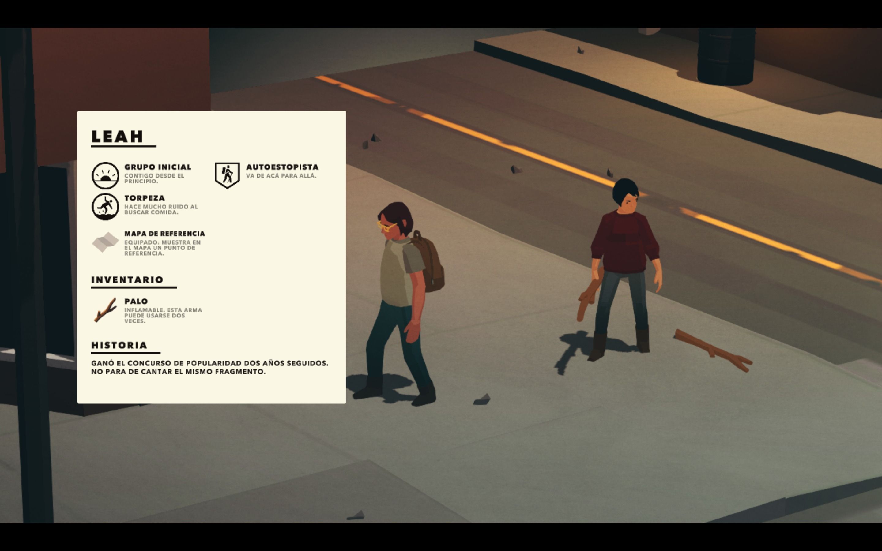 Tras la finalización de cada escenario, en Overland habrá momento para intimar, conocer a nuestros compañeros de viaje y adentrarnos en sus vidas pasadas y presentes. No, no esperéis diálogos abrumadores. El mismo diseño minimalista que impregna la jugabilidad o la propia presentación también extiende sus redes en este ámbito. Todo está sopesado en su justa medida, con frases muy bien pensadas, descripciones del pasado de nuestros protagonistas bien redactadas y con comentarios que aderezan incluso las situaciones más tensas y complicadas.