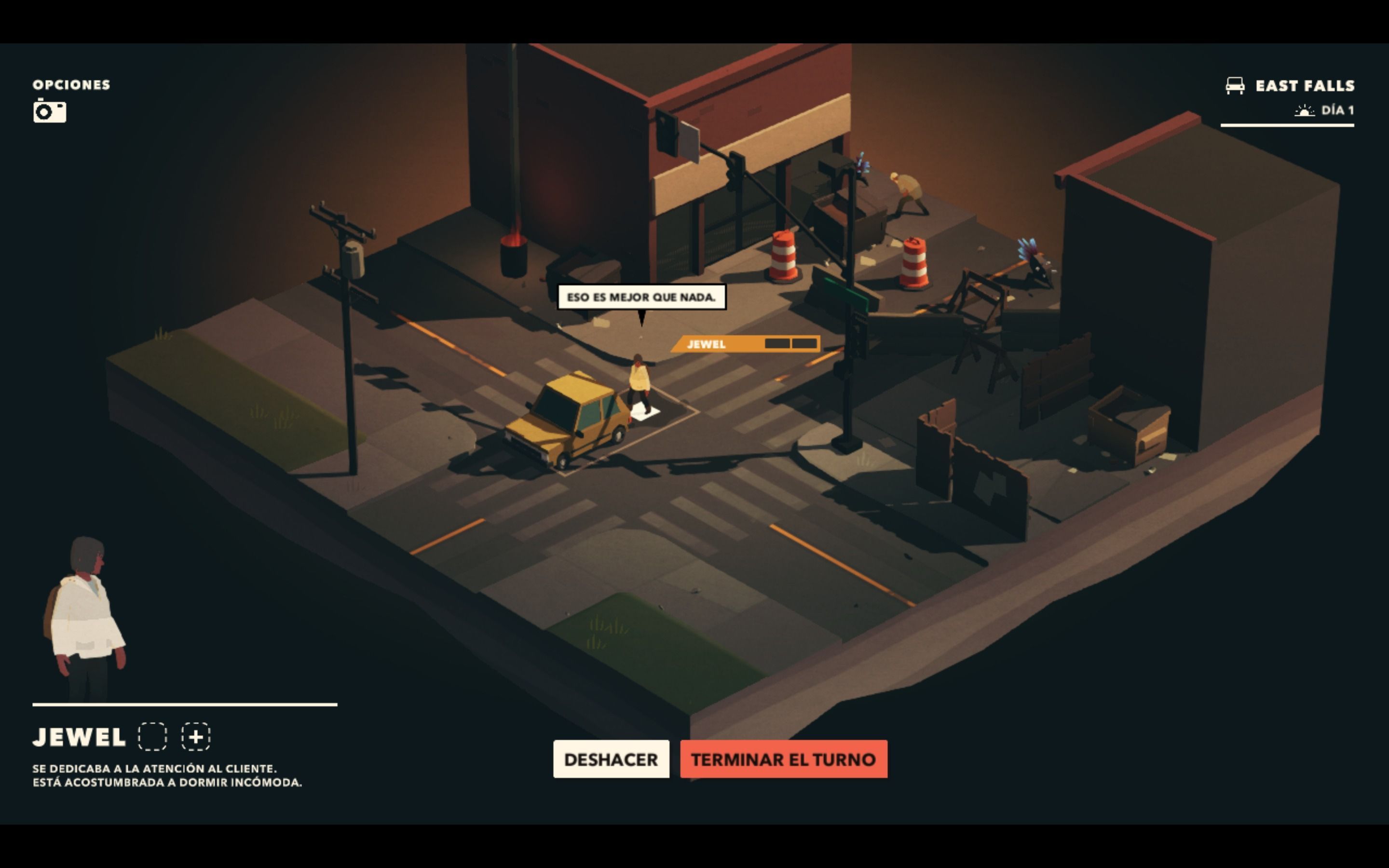 Hablamos de un diseño muy cuidado y sólido en todos sus aspectos, que nos abrazará una vez comencemos a jugar, y en el que apenas hay que explicar nada. A través de una perspectiva isométrica, Overland presenta sus minúsculos escenarios, que van desde calles y avenidas de ámbito urbano a solitarias gasolineras, áridos parajes rurales o interminables carreteras y autopistas llenas de vehículos varados en un intento desesperado de escapar de lo inevitable. Con apenas unas cuantas opciones por turnos, tendremos que manejar a un nutrido y diversos grupo de supervivientes, desplazándolos por casillas en busca de víveres o de la salida concreta del lugar en el que nos encontramos. ¿Nos arriesgamos a recoger esa lata de gasolina o ese botiquín que tanta falta nos hace o echamos a correr antes de que los monstruos nos alcancen?