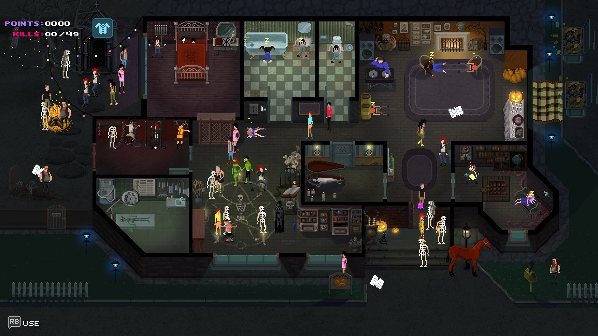 La pantalla de Party Hard es algo así a un pequeño mundo abierto, con la actividad siempre en marcha. La mayoría del público tiene un comportamiento típico, y como os comentamos en nuestras impresiones, hay grupos de personas charlando, parejas que buscan intimidad, solitarios borrachos, gente con sueño o ganas de bailar, cada uno con un tipo de reacción a nuestras acciones y al movimiento de despiste –bailar-. Si quieres provocar movimiento entre invitados estáticos, fuerza rechazo y acabarán marchándose a otro lugar.