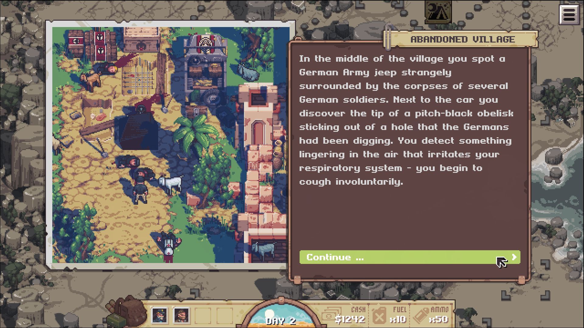 Dado que nuestra misión es encontrar secretos, descubrir nuevas rutas o toparnos con personajes y eventos que podrían pasarse por alto si no estamos atentos -Pathway tiene un componente de imprevisibilidad, propio del género de rol que le sienta muy bien-, os podemos asegurar que pasaremos mucho tiempo en cada partida, escudriñando lugares y pensando si elegir una ruta u otra, como si de un juego de mesa o tablero se tratase y por el que vamos pasando de casilla a casilla. El título recompensa este esfuerzo, que no es en vano, pues podemos morir y caer bajo las armas del enemigo, pero la experiencia que recaben nuestros protagonistas exploradores se conservará, ofreciéndonos un cierto progreso en cada partida. Otro aspecto muy interesante en estas lindes es que, una vez encontremos un artefacto o ítem arcano y religioso, tendremos la posibilidad de venderlos y así obtener bonificaciones para nuestras aventuras, que irán desde más gasolina y más munición para nuestras armas.