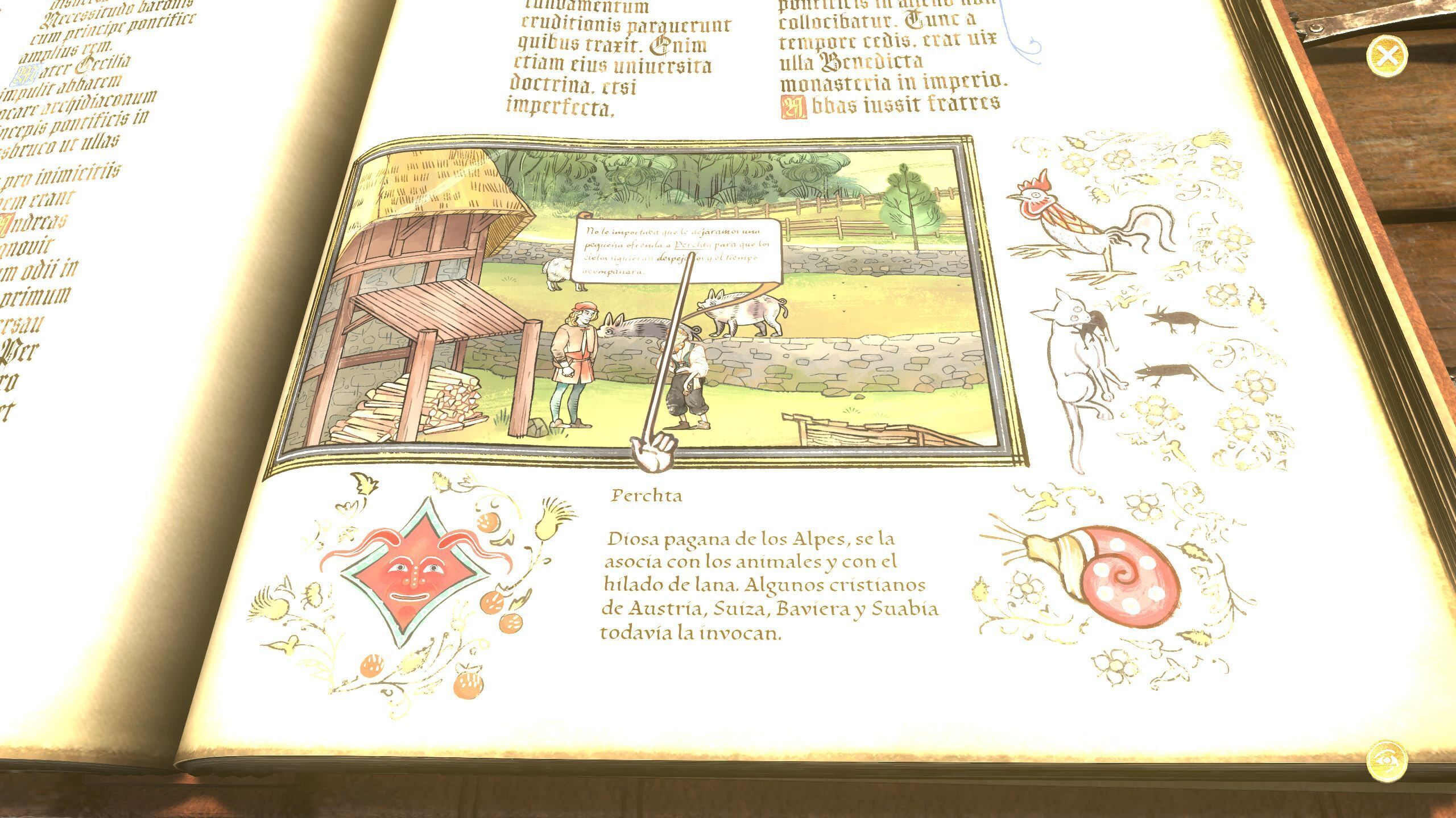 Hablamos mucho de, valga la redundancia, hablar, porque eso es lo que haremos la mayor parte del juego. En Pentiment nos movemos por el pueblo, sus hogares, el campo, el monasterio y otras zonas que rodean Tassing de manera bidimensional. Cada zona es un escenario único, una pantalla, y accedemos a la siguiente haciendo click (o pulsando el botón; la interfaz y el control están pensados para mando) sobre el icono correspondiente, algo que se representa como un cambio de página en el tomo manuscrito que narra esta historia. En esos escenarios encontramos multitud de personajes con los que charlar, siempre y cuando tengan algo nuevo que contar.