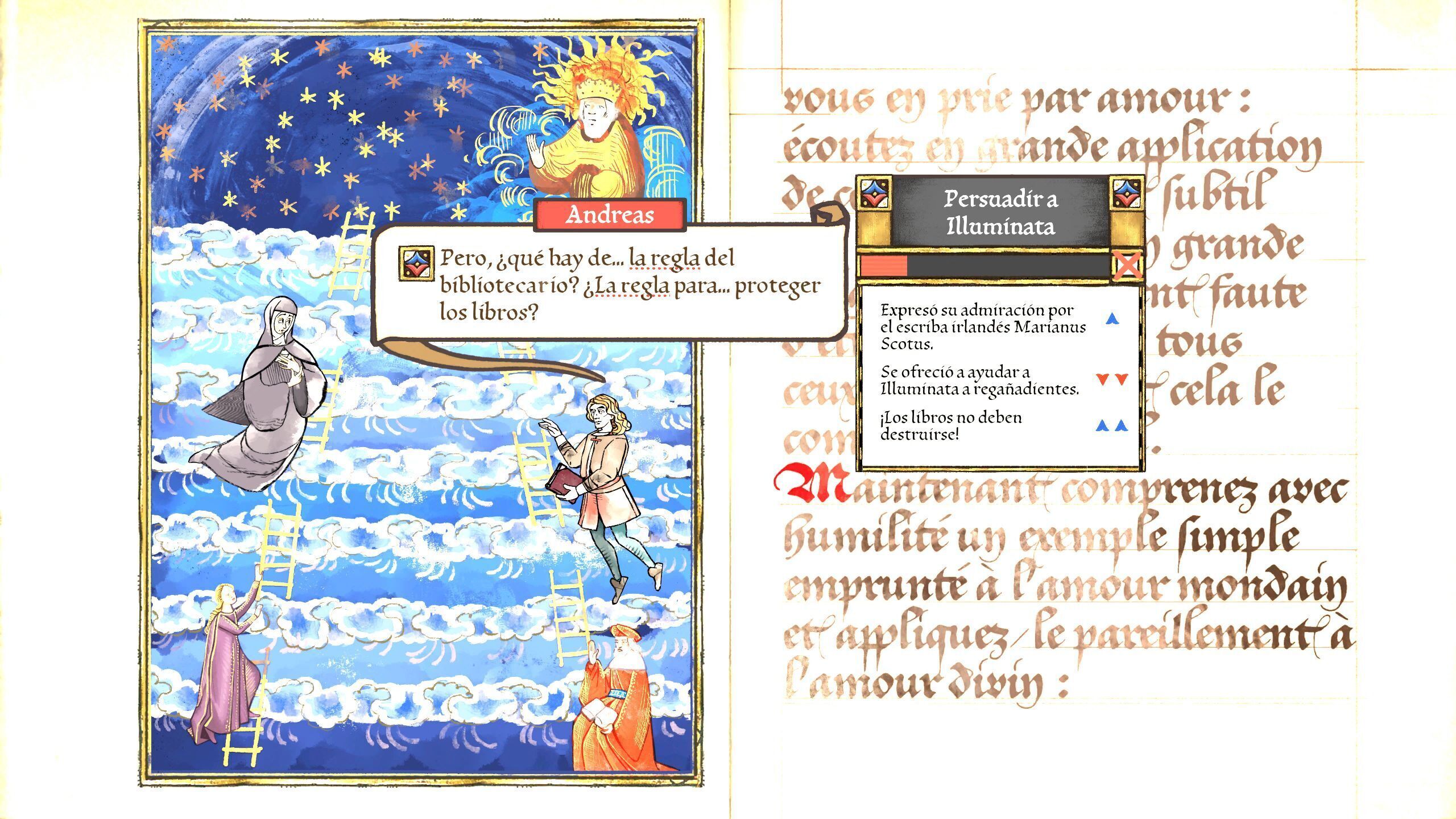 Son temas grandes que nos permiten participar en interesantes debates filosóficos, que nos obligan a tomar decisiones complicadas, y que se abordan de un modo que incita al roleo: no respondemos y decidimos como el jugador del Siglo XXI, sino como el artista, más o menos progresista según nuestro comportamiento, del Siglo XVI. Podemos tener las ideas que queramos sobre las religiones, pero siempre diremos Amén antes de cada comida. Como no podía ser de otra manera al tener que profundizar en cuestiones tan inabarcables, la trama se va cociendo a fuego lento mediante conversaciones numerosas y extensas, pero consigue construir de manera paulatina la tensión y encajar bien las detonaciones de la misma. Todo ello a través de tres actos, tres momentos temporales separados mediante elipsis por un puñado de años, que nos permiten ver cómo Tassing y sus gentes avanzan en este periodo histórico tan convulso.