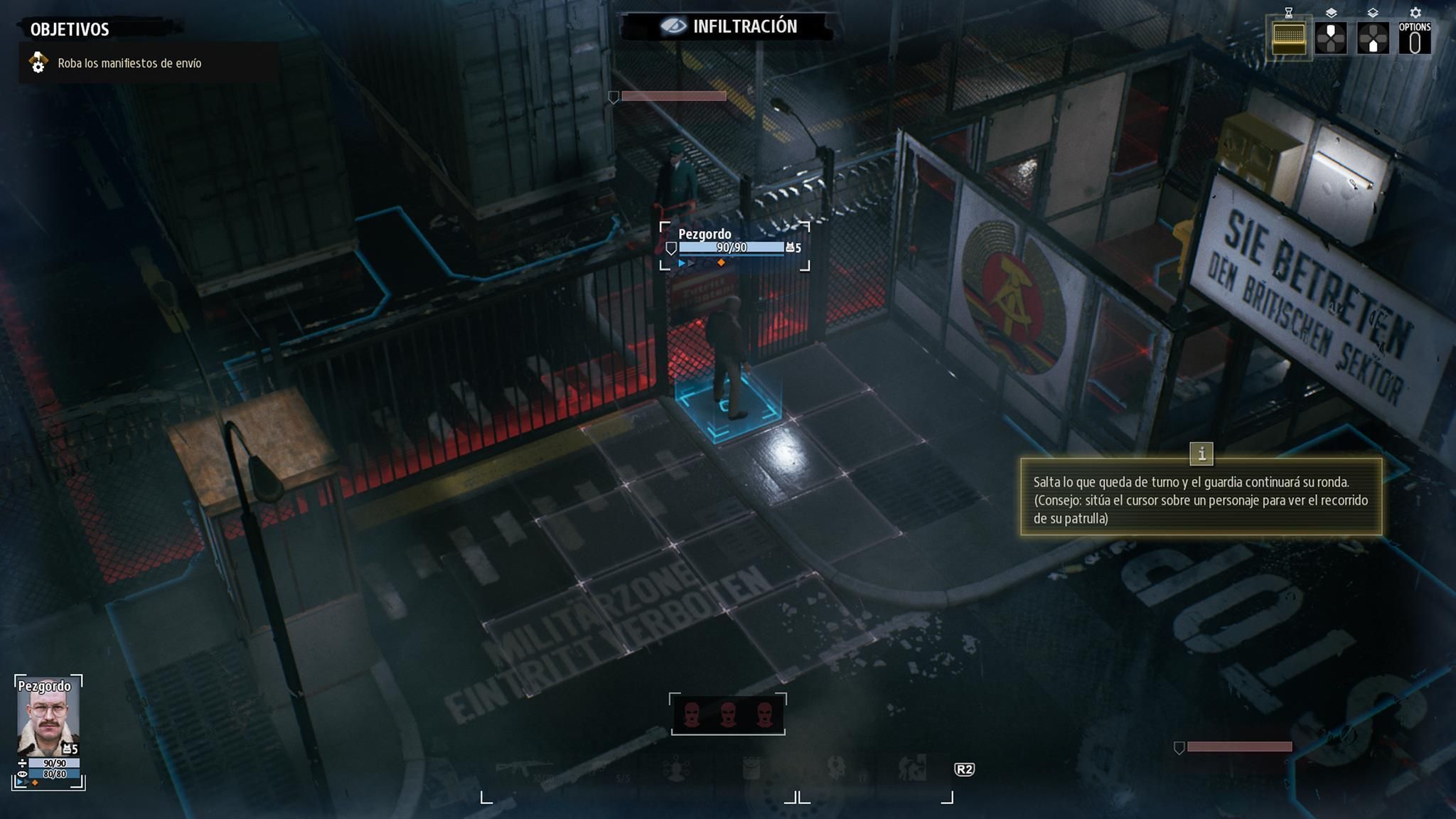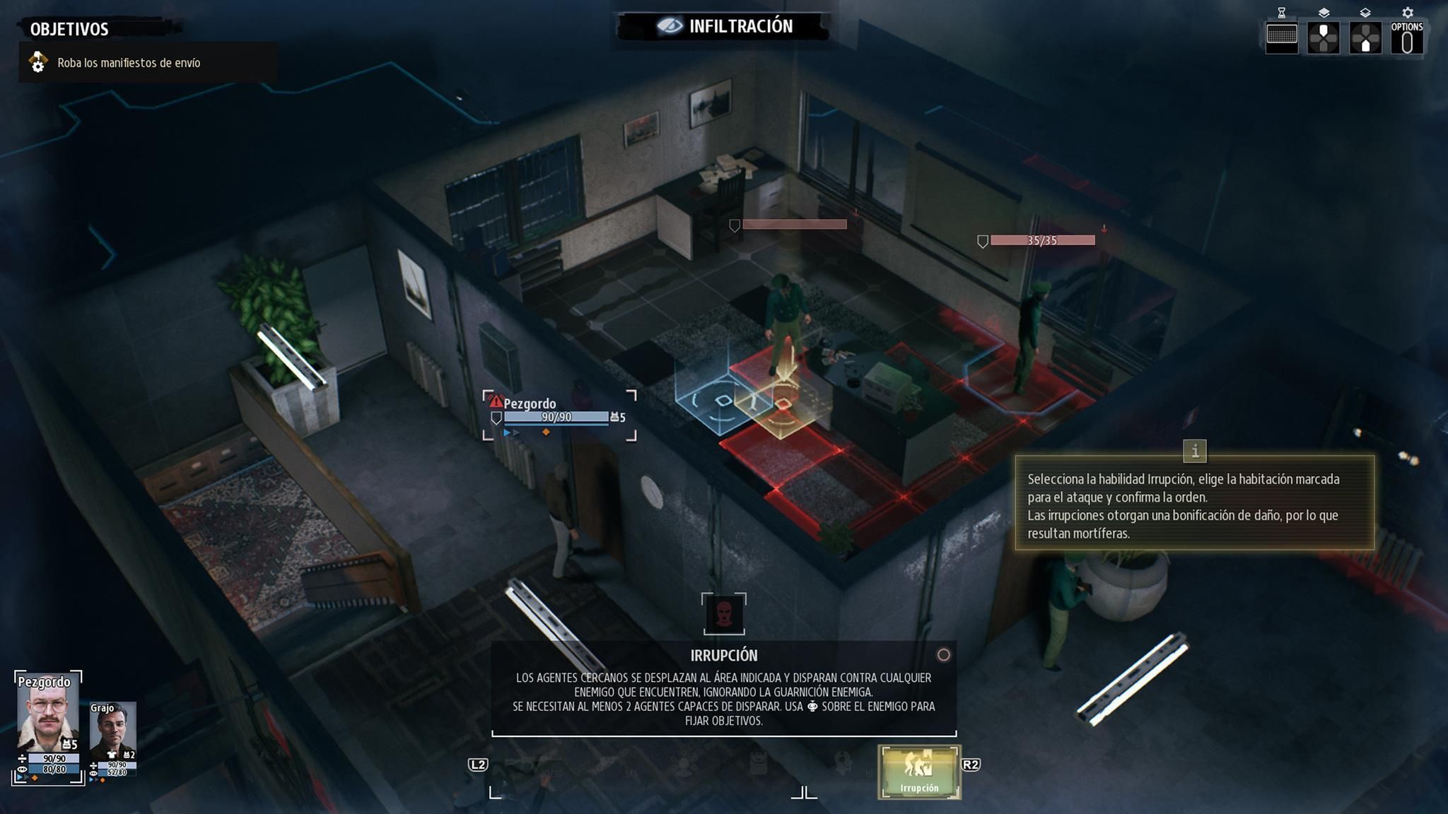 En nuestro turno podemos tomar el camino más corto o estudiar primero habitaciones cercanas que quizás nos ayuden a desactivar cámaras, conseguir documentos, neutralizar enemigos que más tarde supondrían un problema o estudiar la ruta de cada patrulla para evitar que nos descubran en plena fechoría; las alarmas suelen complicar mucho la partida. También hay opciones curiosas, como activar a agentes durmientes que pasarán a nuestro control, con la ventaja de moverse más libremente entre las filas enemigas.