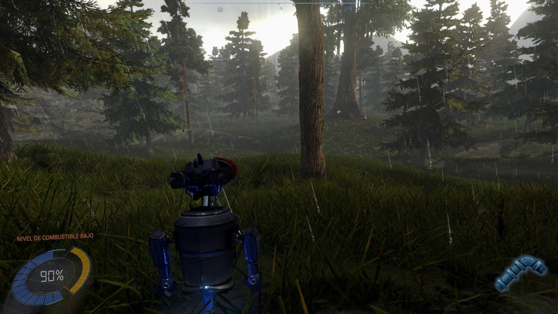 ION y el robot ANI van a investigar un precioso mundo natural repleto de vegetación, grandes extensiones y animales salvajes. Los desarrolladores lo han definido como un juego de exploración y supervivencia, y esas son las categorías en las que mejor puede encajar. Nuestra misión suele consistir en recoger recursos a lo largo del escenario para construir herramientas, cargar combustible o reparar nuestra salud. Una brújula en la parte superior nos indica la ubicación de elementos primarios, así que no suele ser difícil localizar un mineral o planta en un radio no muy lejano.