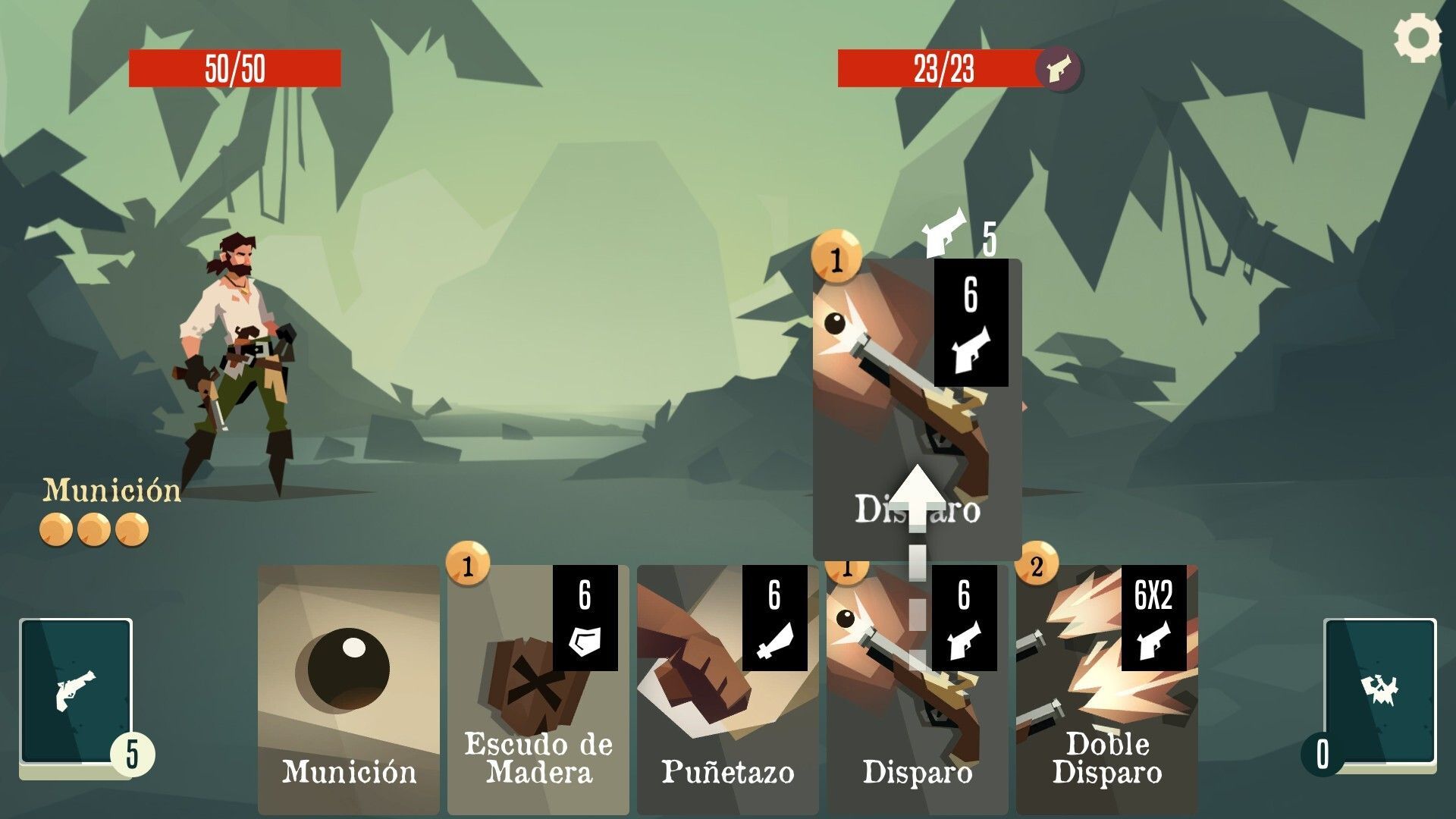En la mayoría de islas nos encontraremos a uno o varios enemigos dispuestos a acabar con nuestro viaje. Las cartas, que equivalen a algún tipo de acción ofensiva o defensiva, se barajan: un disparo, ataque físico, escudos… más todas las variantes posibles –dobles disparos, disparos penetrantes, tiros multiplicados…- a los que se suman algunos potenciadores de daño, o para debilitar a enemigos, de todo un poco. La mayoría tiene algún tipo de coste de munición: para disparar necesitamos el coste de balas de esa carta –balas que, normalmente, se recargan con otras cartas-. Hay que buscar un equilibrio entre atacar a los enemigos y prepararnos para la inminente oleada de movimientos del enemigo. En realidad se trata de un maratón, no un sprint: lo difícil es avanzar con suficiente salud como para afrontar con garantías las batallas que nos esperan más adelante, porque cada batalla individual es asequible.