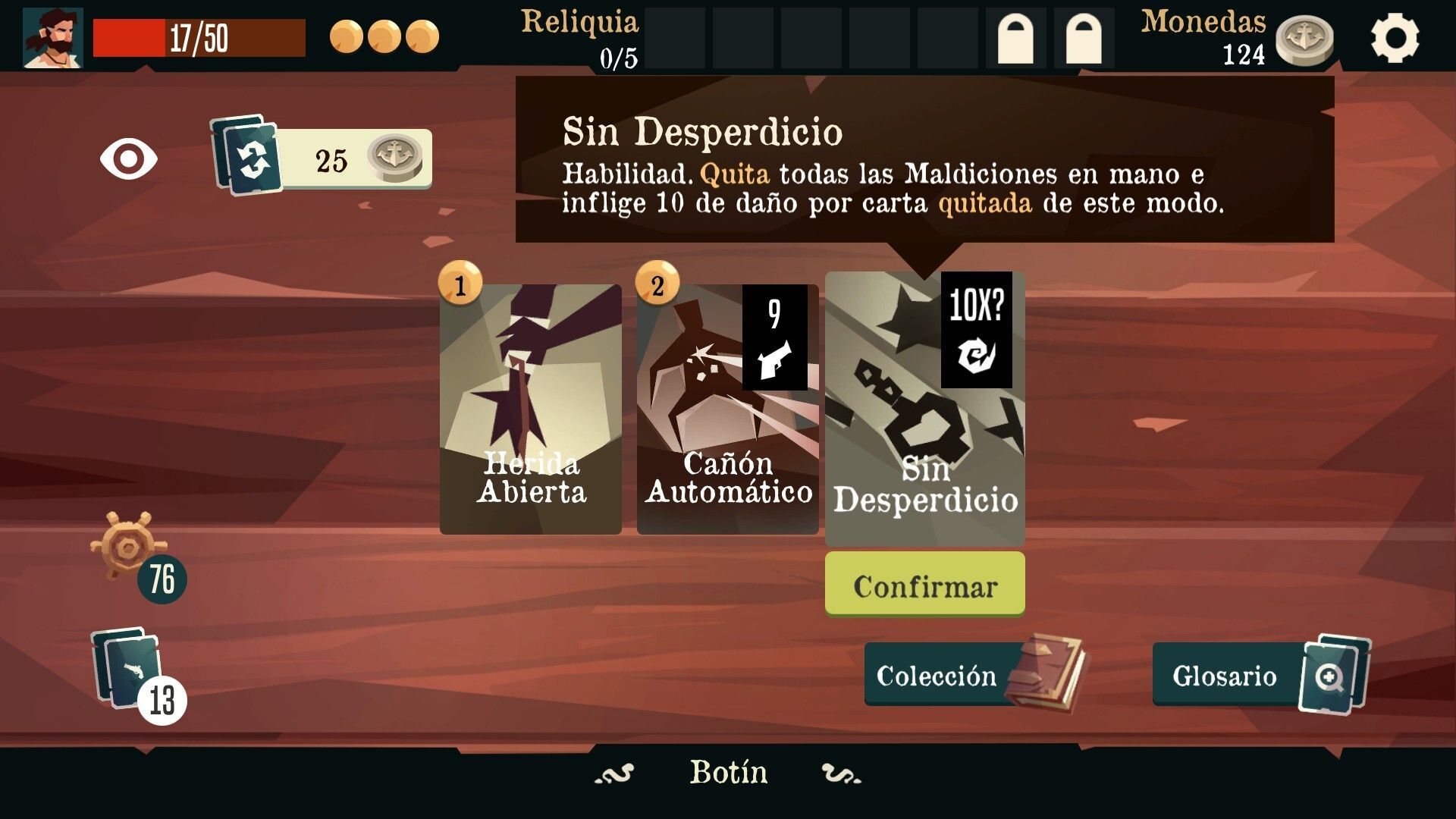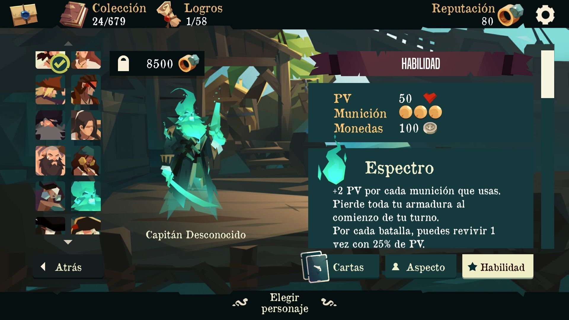 El objetivo general es avanzar por un mapa con diversas bifurcaciones –islas con combates, tabernas, islas con tesoros, etc.- y llegar hasta el final, donde nos espera un jefe. Además, conseguiremos nuevas cartas, recompensas, monedas, reputación… Logres tu victoria o no, siempre hay esa sensación de no haber perdido tu precioso tiempo, porque la vuelta tendrá algún tipo de extra. Hay 500 cartas, más de 150 reliquias, más de 100 de bandidos –humanos, no muertos, espectros-, más de 50 jefes, 6 capítulos diferentes… Suficiente contenido para que no te quemes rápido.