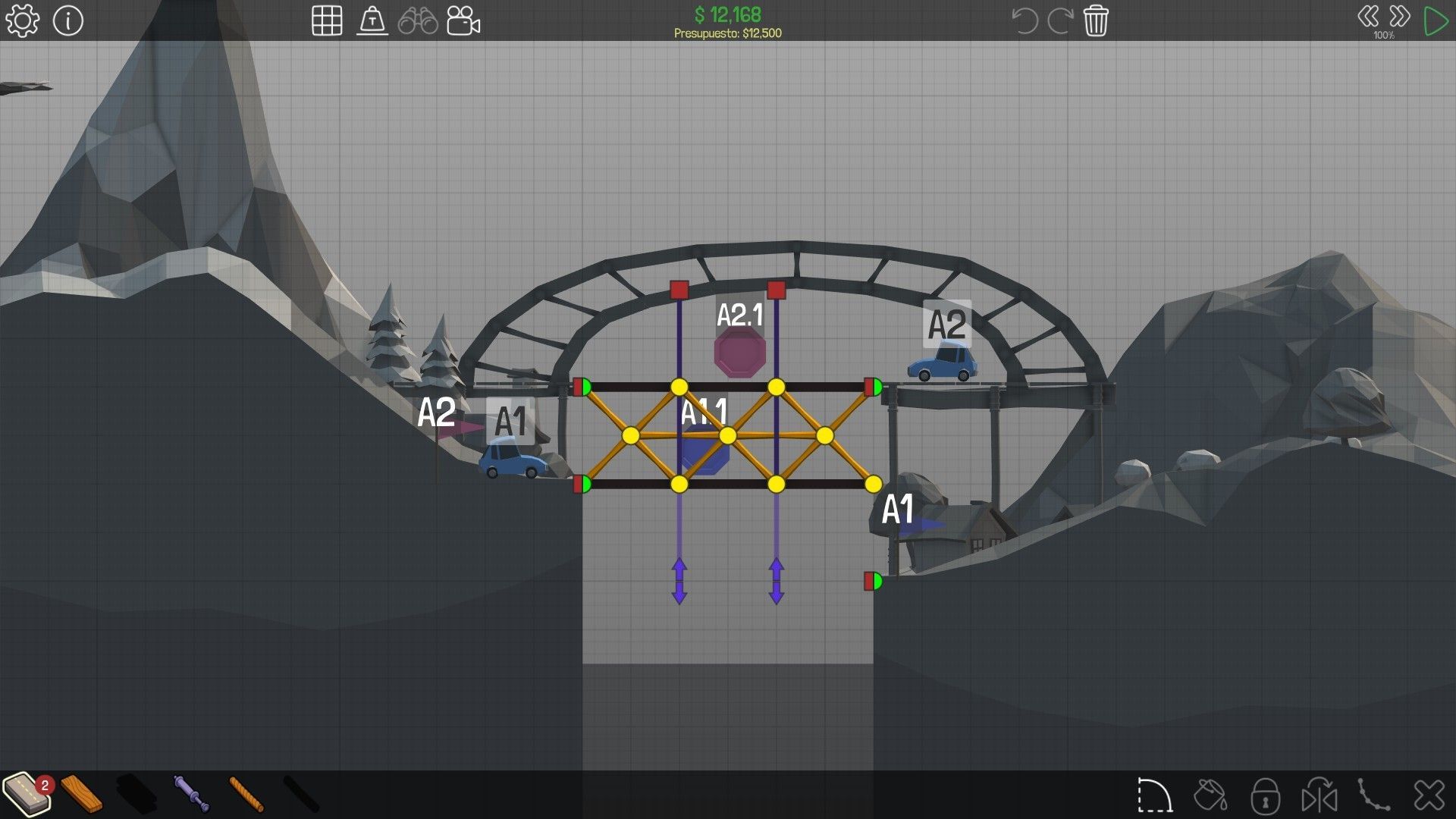 Cada uno de estos materiales tiene un coste en metros, un valor de resistencia, y no en todas las fases podemos utilizarlos todos, ya que suelen ponernos ciertas limitaciones para complicar las cosas. Hay diferentes vehículos que tenemos que llevar a la meta, con mayor o menor peso, y ahí radica la dificultad, en construir estructuras lo suficientemente robustas como para que aguanten el peso de los vehículos.
