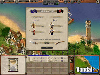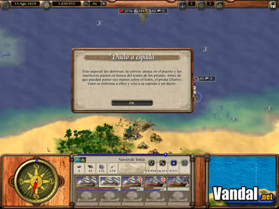 Finalmente, para concluir con las batallas navales hay que añadir un dato más. En algunas ocasiones, el capitán del convoy enemigo te retará a duelo para resolver la disputa, de manera que no se produzcan más bajas de marineros. Entramos entonces en lo que es el modo de duelo, un capitán contra otro a sablazo limpio. Este modo de duelo lo veremos además en ataques a ciudades, o contra algún pirata, que nunca se rendirán sin desafiarte antes. El duelo es bien sencillo: simplemente hacemos ‘click’ con el ratón en las partes del cuerpo del enemigo que queramos estocar, y nuestro capitán intentará golpearle. Intervienen el factor cansancio y, por supuesto, la vida. No podemos agotarnos dando estocadas, habrá que ir recuperando el aliento y defendiéndonos con el botón derecho del ratón. ¡El resultado de la batalla depende de la victoria!