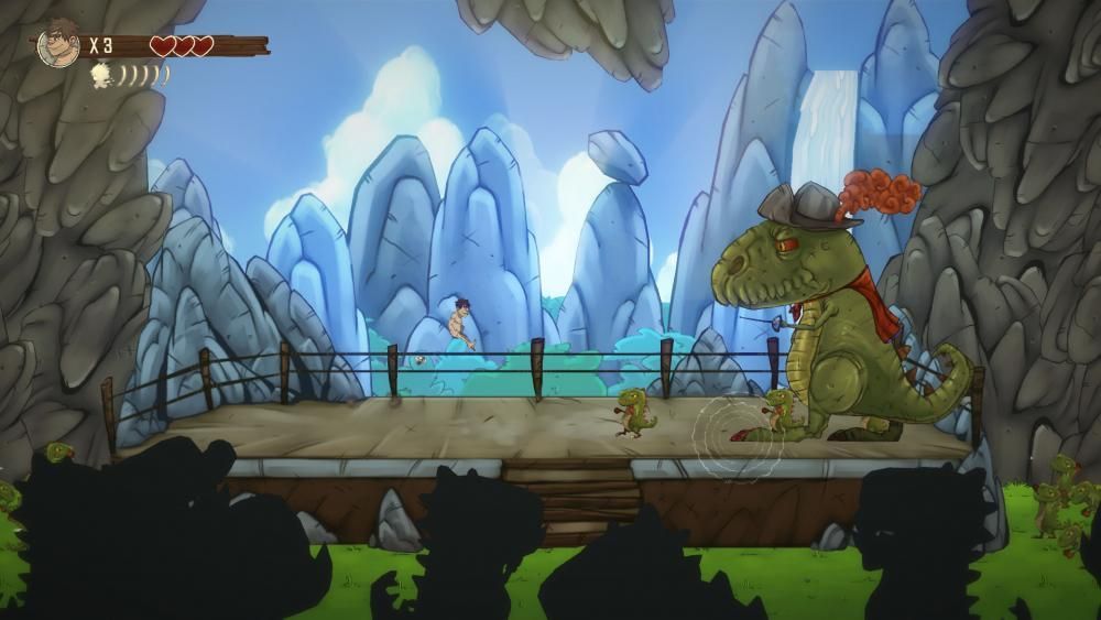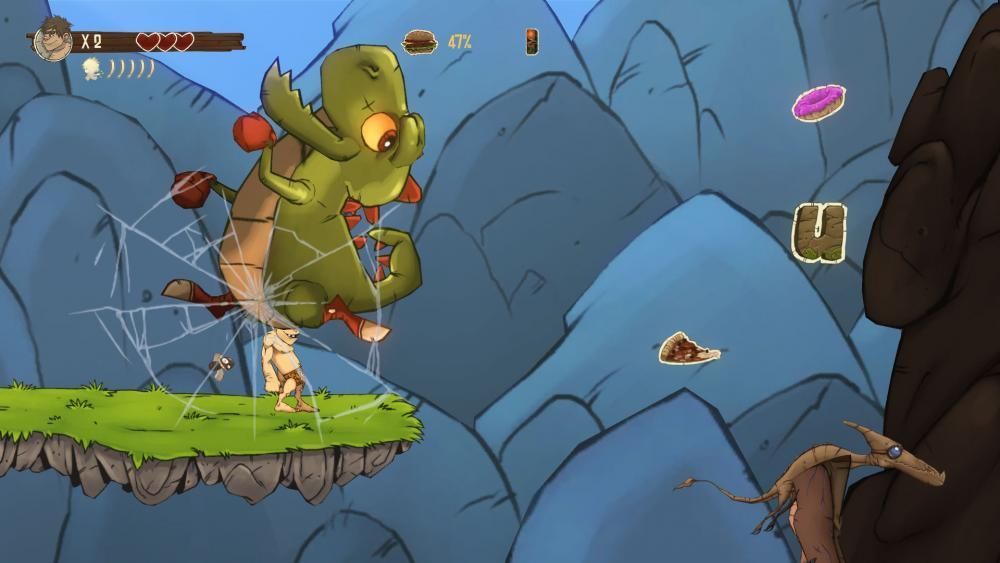 Su propuesta era bien sencilla: éramos un troglodita que tenía que buscar comida para alimentar a su tribu, motivo por el cual nos embarcábamos en un viaje. Esto nos obligaba a recoger una cantidad determinada de comida antes de poder pasar al siguiente nivel, por lo que no solo nos teníamos que preocupar de avanzar y sobrevivir, sino también de recolectar. Sin embargo, estaba lejos de ser un juego perfecto, ya que sus controles dejaban mucho que desear (de ahí la alta dificultad de la que hemos hablado antes), con un salto muy poco preciso y muy difícil de dominar y una animación de ataque que nos obligaba a calcular milimétricamente cada golpe si no queríamos recibir daño.