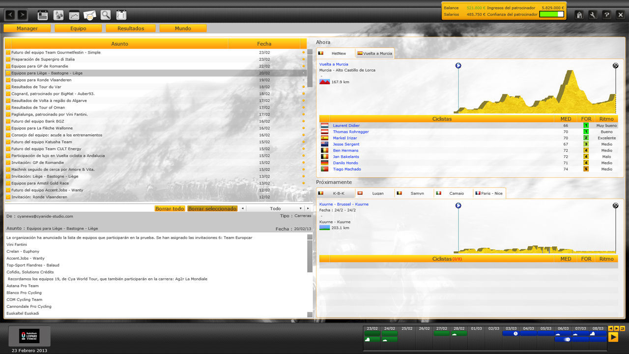 La mayoría de pautas y rutinas vistas en ediciones anteriores, vuelven prácticamente idénticas. Planificar la temporada vuelve a ser una cuestión de segmentos de tiempo y periodos -algo, que facilita muchos las cosas a la hora de invertir y gastar dinero-, así como se sigue gestionando a los deportistas y ciclistas de la misma manera, etc. Vuelven a tener importancia los ojeadores y los entrenamientos y concentraciones previas a los eventos deportivos, ya que nos permiten un amplio margen de mejora en algunas de sus cualidades. Un plus extra que nos puede ayudar a perfeccionar a nuestros corredores en distintas facetas deportivas -algo ideal si queremos llegar a ser competitivos en conjunto más allá de depender exclusivamente de la estrella del equipo-. Es aquí, en los tiempos de carrera y en la posterior recuperación de los corredores, donde Cyanide ha puesto más empeño en la edición de 2013.