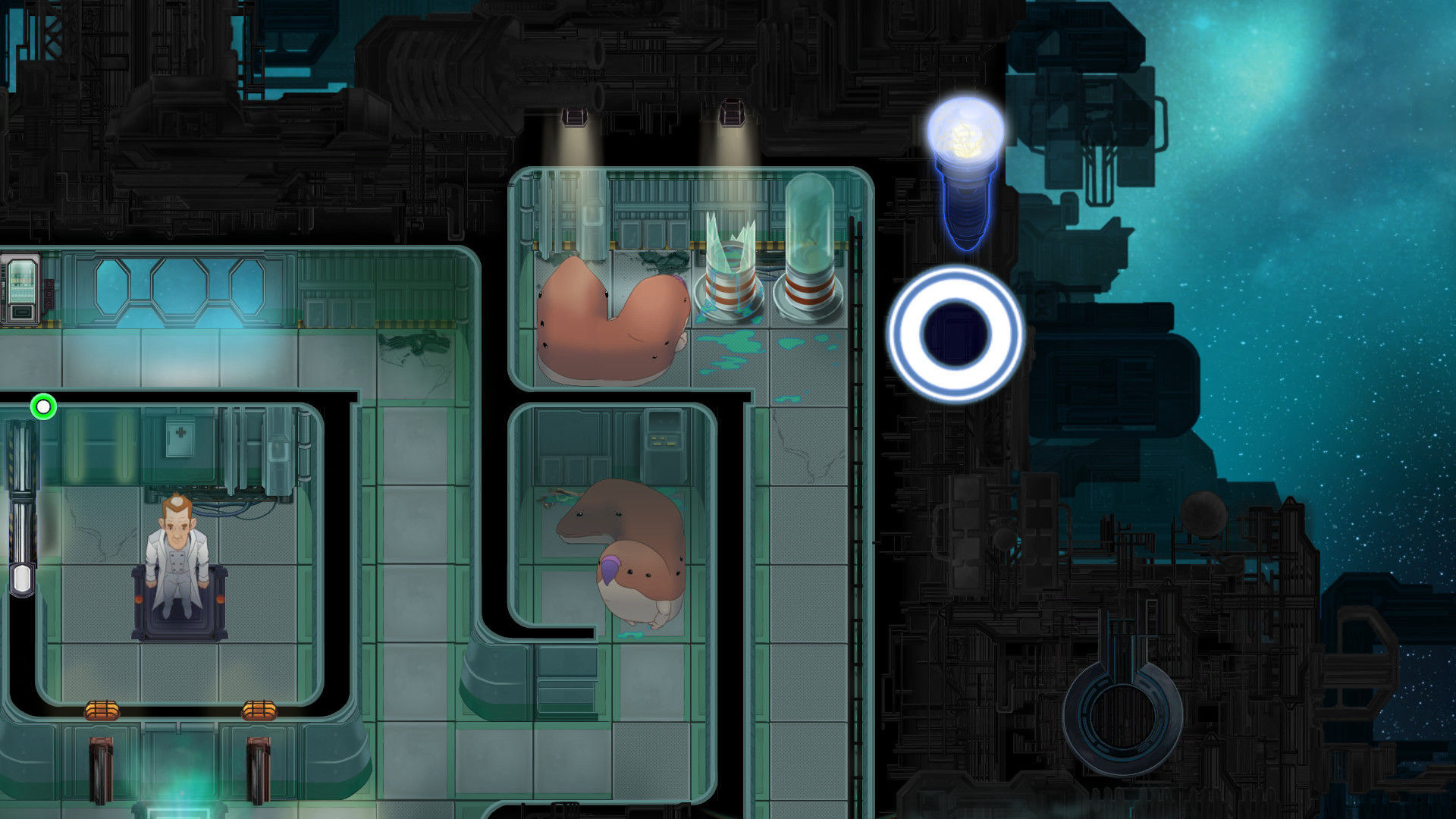 Así, en el juego hay siete razas alienígenas, cada una con sus propias características. Por ejemplo, nada más empezar conocemos a la raza Vermis, que es una especie de gusano que de normal tiene una pinta más o menos agradable, pero que cuando ve un humano cambia de aspecto a algo mucho más amenazador, y de hecho si nos encuentran y no hay nada en medio nos despacharán de una manera bastante clara. Pero además, los vermis, por ejemplo, no saben encontrar caminos por sí mismos, pero sí que nos pueden seguir, algo que tendremos que tener en cuenta a lo largo de la partida. La segunda especie que nos encontraremos son los sagittas, una especie de bola con un ojo enorme, que una vez nos ven se tiran a por nosotros, para ir a la posición exactamente donde estábamos en el momento de moverse. Si nos movemos, volverán a ir al punto en cuestión.