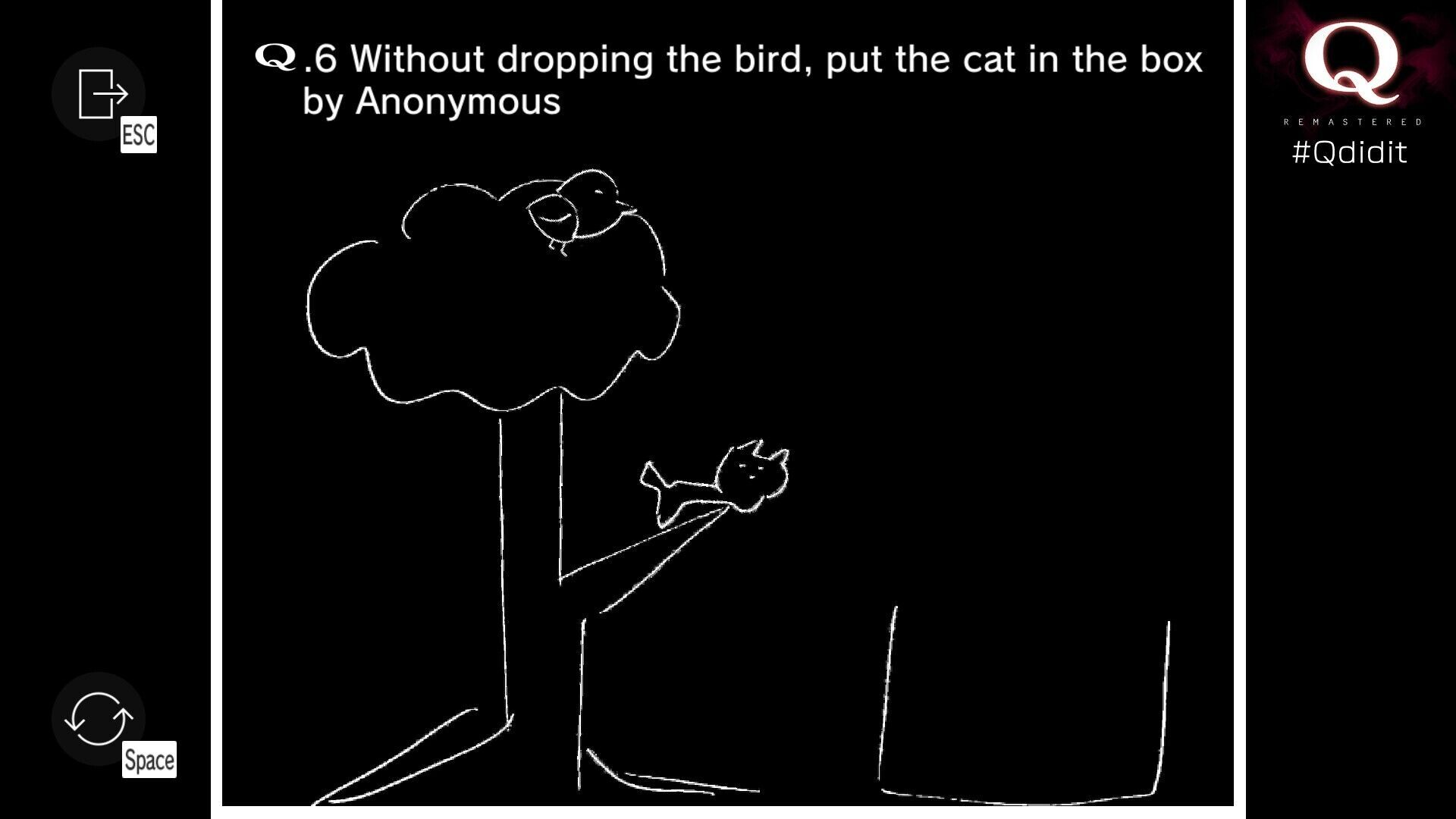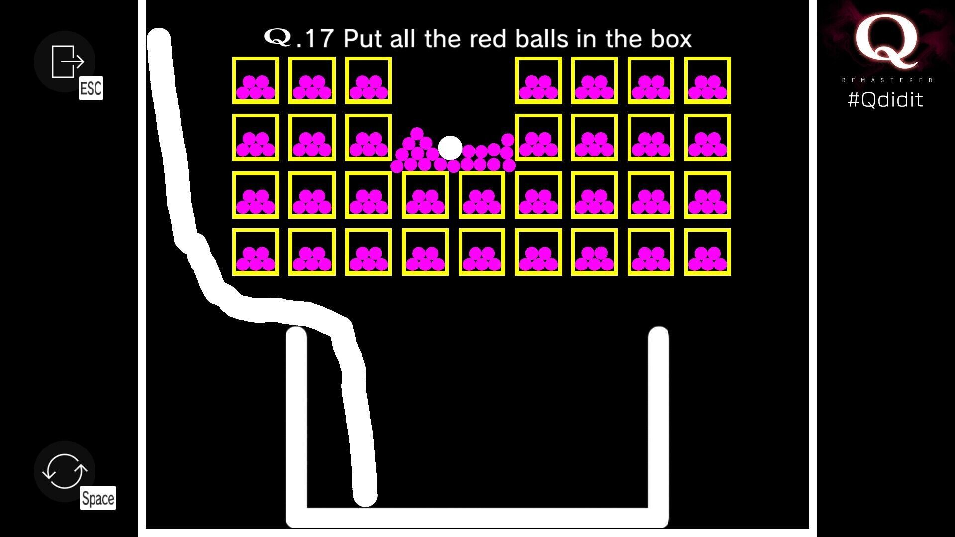 Hay momentos en los que Q Remastered se deja disfrutar: los primeros minutos cuando vas descubriendo cómo funcionan las físicas y cómo reaccionan con tus garabatos, cuando vas explorando las muchas categorías y te sorprende con un desafío muy distinto a los demás, cuando hace alguna genialidad humorística con la propuesta o con la resolución de la situación. Pero lo que ofrece es eso: desafíos, situaciones, muy pocos brillantes, y la mayoría imposibles, una avalancha de ideas, algunas muy buenas, pero poco reflexionadas.