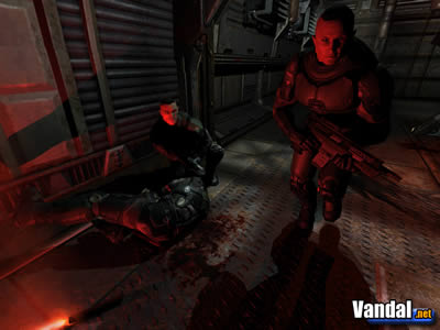 Pero como decimos, si por algo destaca este motor gráfico es por la capacidad que tiene a la hora de generar sombras de manera realista. Habrá niveles del juego en los que la luz será muy tenue, disfrutando así de unos juegos de luces y sombras realmente espectaculares: las chispas que saltarán de los paneles dañados salpicarán las estructuras metálicas, mientras las luces de emergencia roja giran y giran iluminando en tiempo real todo el escenario, las unidades que puedan estar en él, y nuestra arma. También habrá zonas completamente oscuras en las que los enemigos nos sorprenderán con sus ráfagas láser que iluminarán el escenario a "pulsaciones", y en las que la linterna será de vital importancia: veremos los haces de luz moviéndose por todas partes –si nos movemos junto a varios marines-, mientras el entorno se va iluminando poco a poco; creando de paso sombras por todas partes, ya sean las de los soldados o las de los objetos que iluminamos.