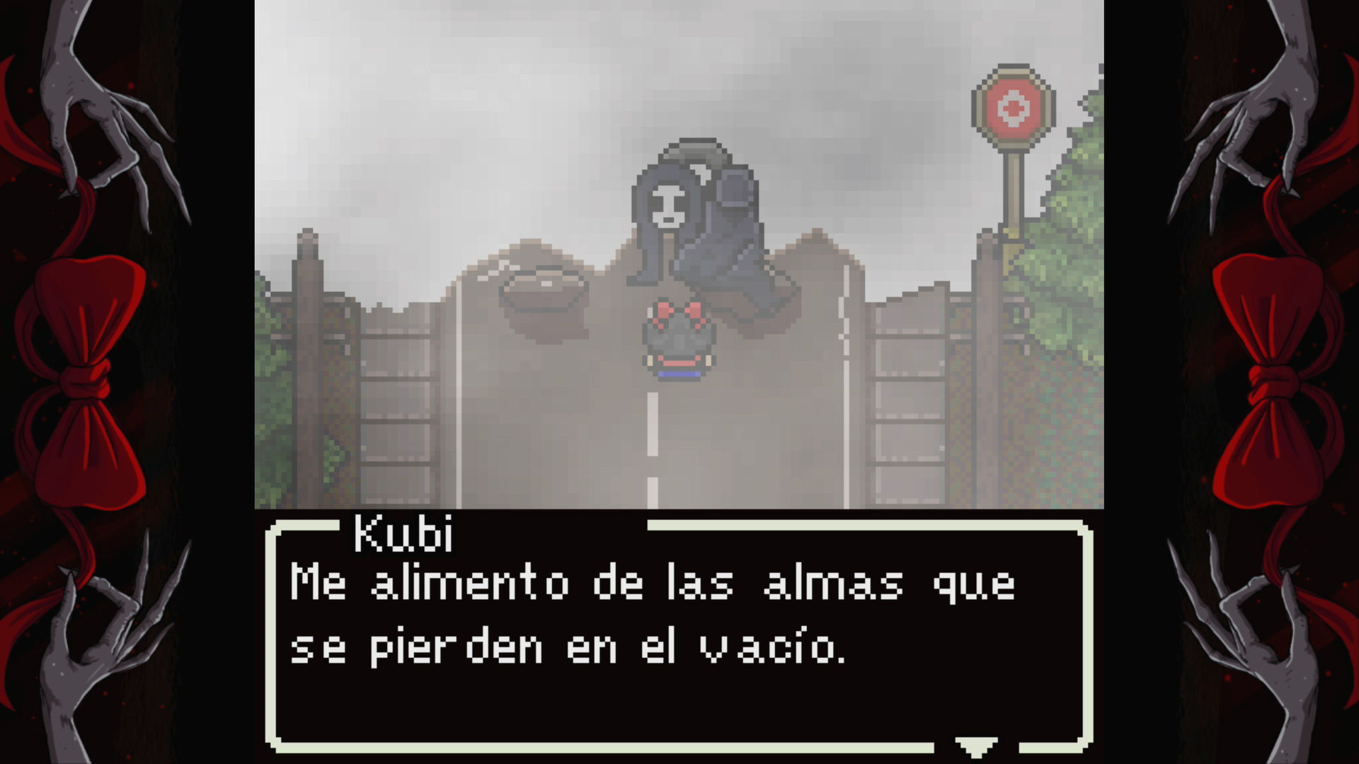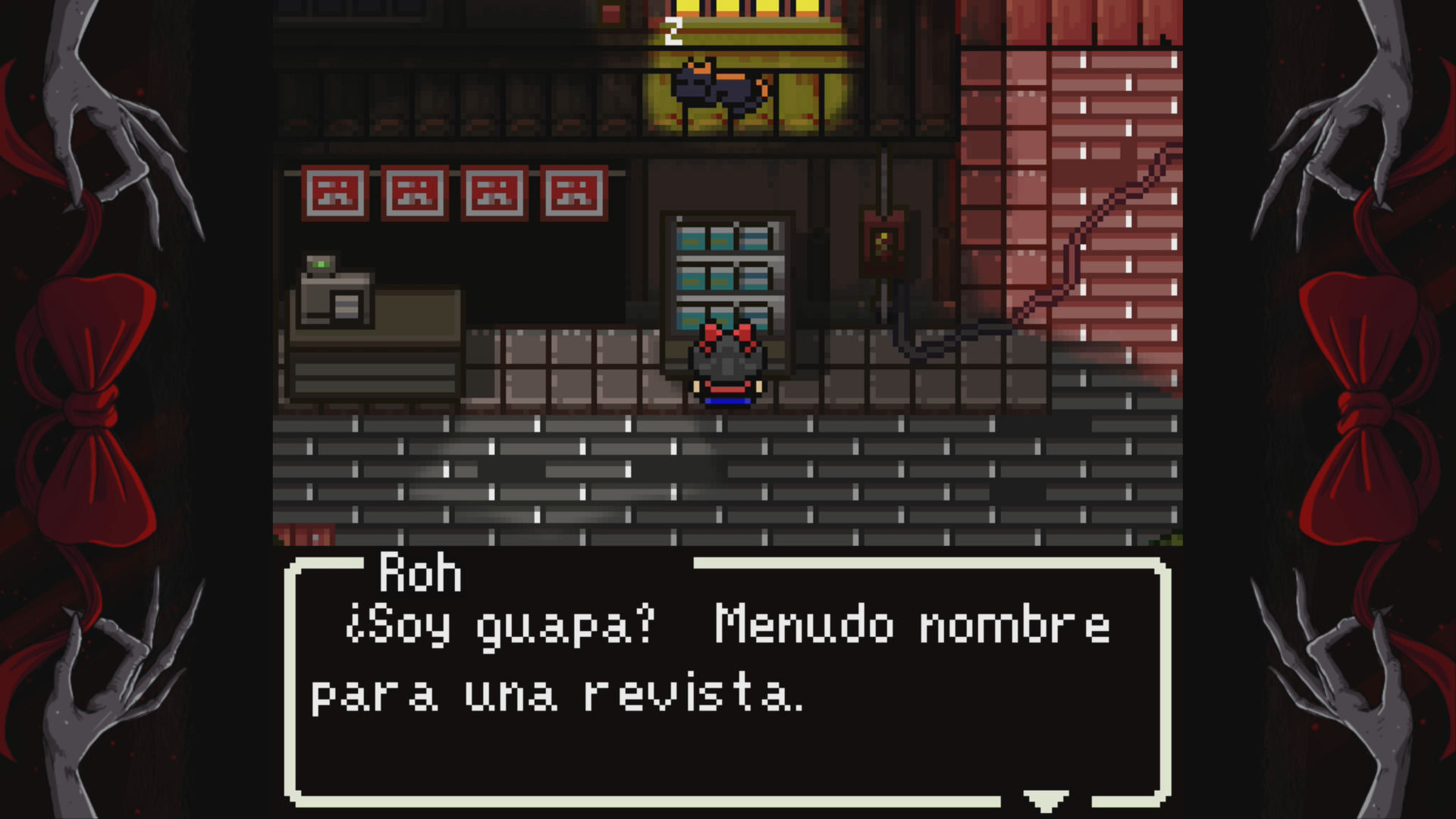 Como se puede ver en las capturas, hablamos de una aventura al estilo retro, de gráficos pixelados del tamaño de un puño y vista superior. Su historia nos presenta a Roh, una joven que parece vivir unas extrañas pesadillas con personajes peculiares, espíritus o monstruos. Si bien Red Bow intenta en algún momento causar mal rollo o tensión –sobre todo inspirándose en leyendas o películas niponas-, no podemos calificar al título exactamente de un survival horror ni de juego de terror, aunque trate algún tema escabroso. En ese sentido la saga Yomawari es mucho más efectiva, tanto en su objetivo de asustar al usuario como en ambición, pero eso no significa que este juego busque competir con el de NIS. Tiene sus particularidades, puntos fuertes y débiles.