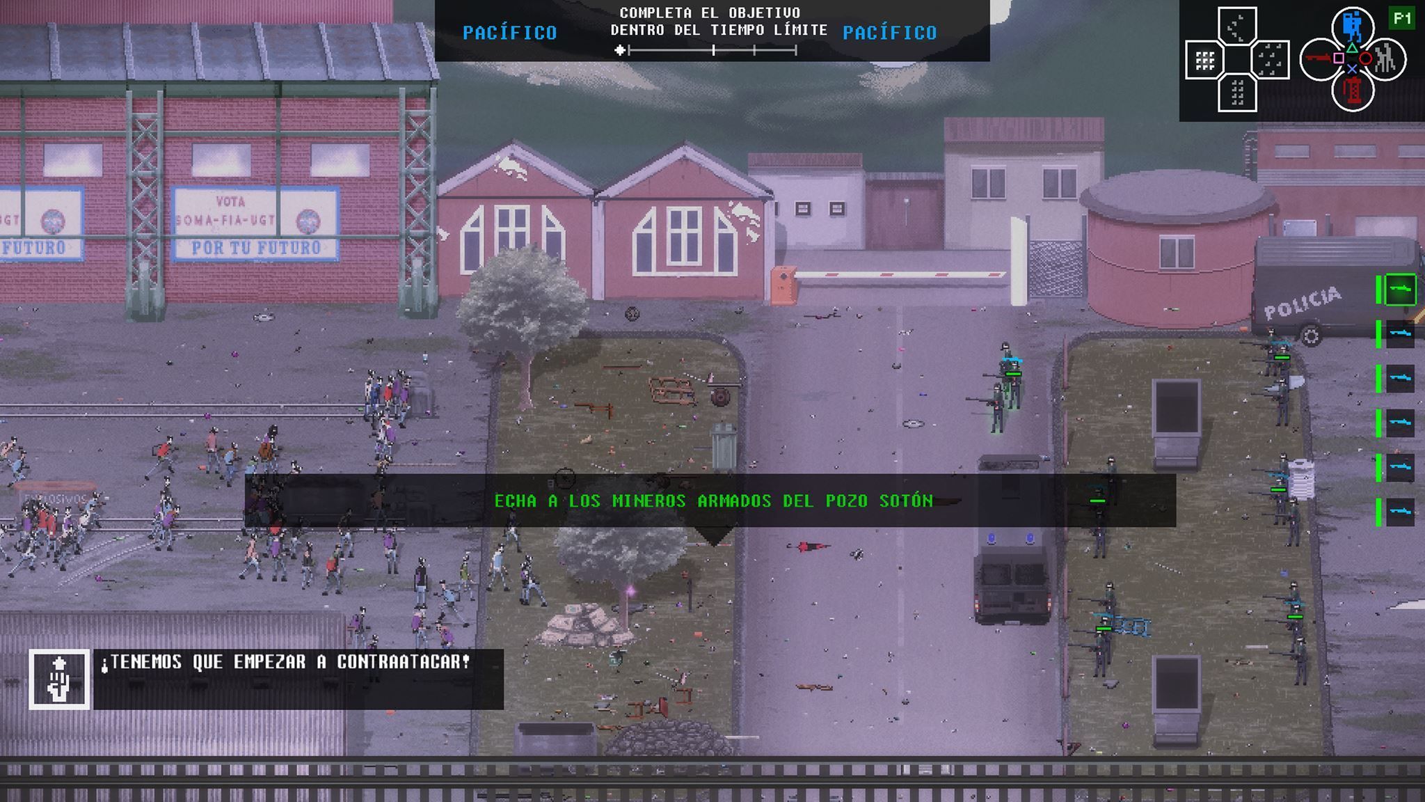 En cuanto a la jugabilidad, con ambos bandos lo que tenemos son grupos de personajes divididos por clases con una serie de habilidades o acciones diferentes. En la policía resulta obvio: unidad táctica, asalto, balística… Sus valores de defensa, cantidad y armamento ofrecen diferentes estrategias. Hay soldados preparados para cargar en grupo que golpean a corta distancia con las porras y son capaces de entrar de lleno en una manifestación, mientras que otros disparan bombas de humo o proyectiles no letales. Antes de la partida podremos editar algunos parámetros de estos policías.