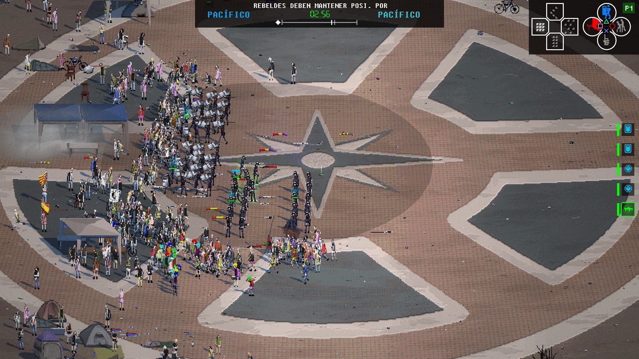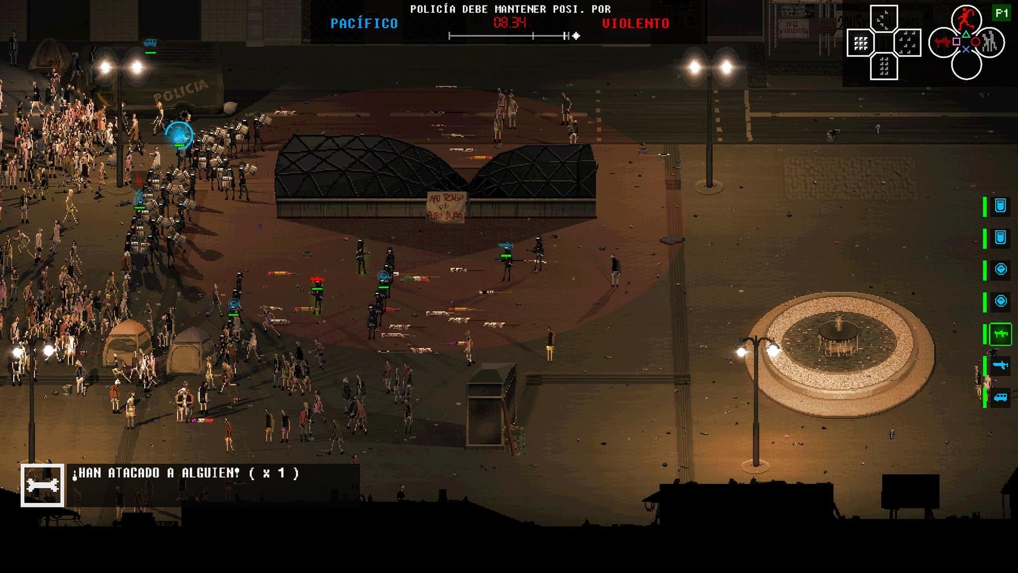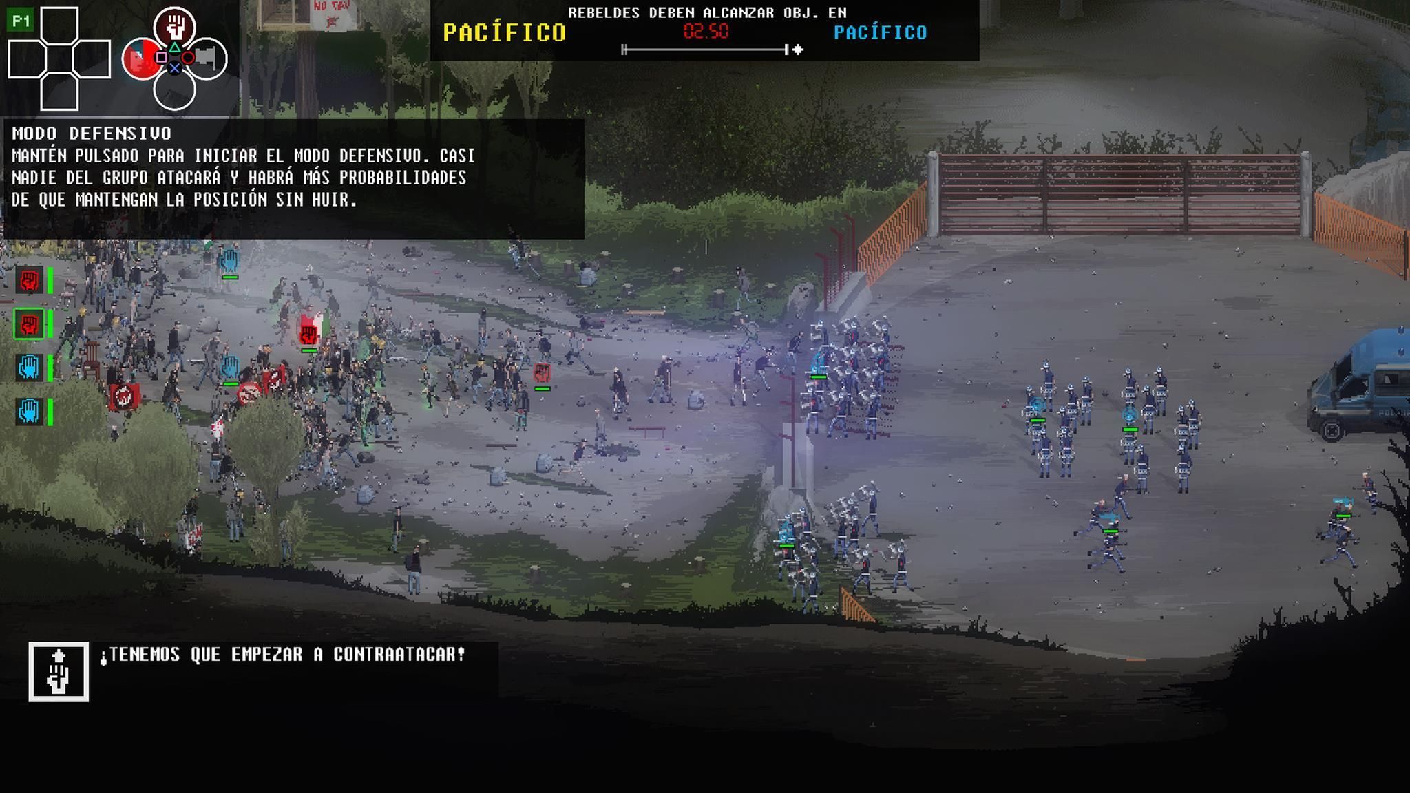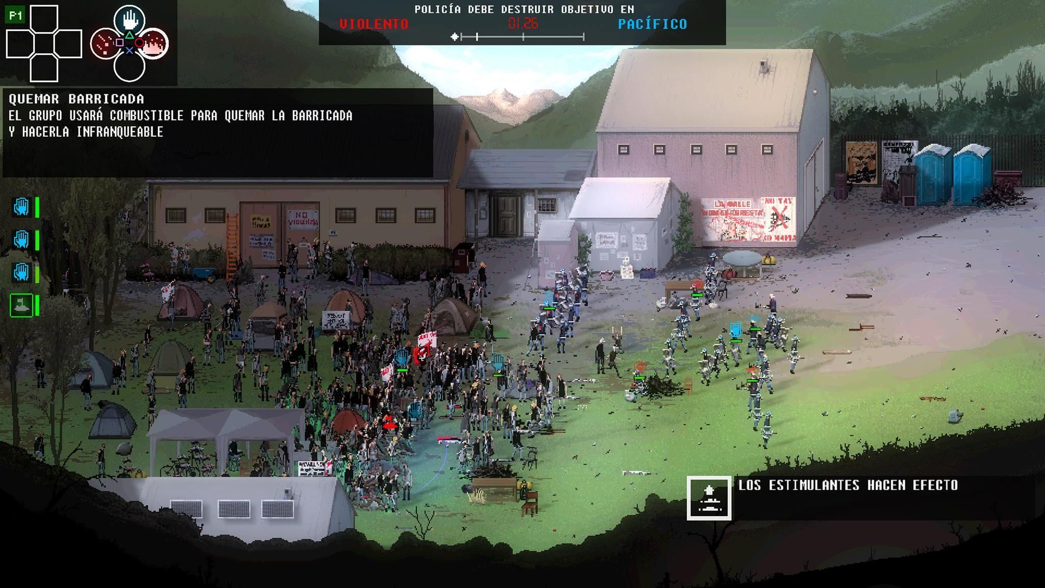 Los manifestantes cuentan con personajes que representan la parte más líder, con megáfono para comunicar mensajes que suben el ánimo de sus compañeros y realizan actos de resistencia pacífica, pero también de grupos más violentos que provocan o lanzan piedras. Al igual que los policías, podremos dar órdenes para que actúen frontalmente o se mantengan en modo defensivo para proteger las posiciones y que nadie huya despavorido.