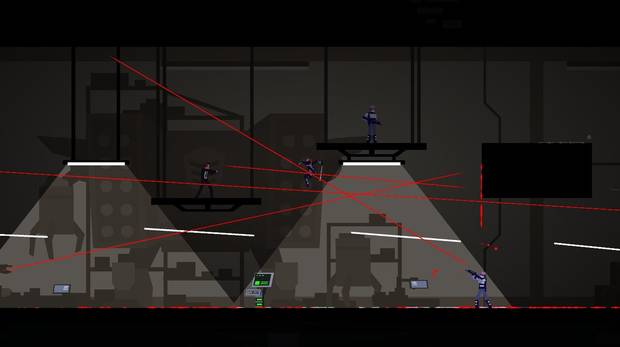 Lo normal es que saltemos, con un sistema que recuerda al mentado anteriormente Gunpoint, y lo normal es que el salto no salga como queremos, algo que es especialmente duro a partir de niveles más avanzados. Con saltos más complicados en los que morir es más sencillo, pero esto es algo de lo que te avisa ya el juego (intuyo que el desarrollador ha sido incapaz de realizar una ayuda visual precisa y ha dejado la que hay para que al menos sirva de referencia al jugador de alguna manera), así que lo tenemos que tener en cuenta y no fiarnos en exceso de esa línea que se marca en la pantalla.