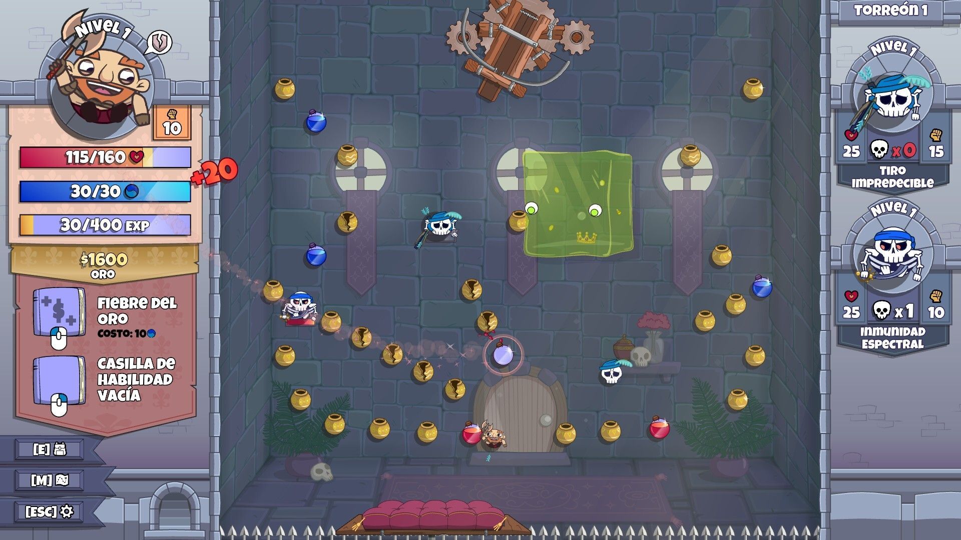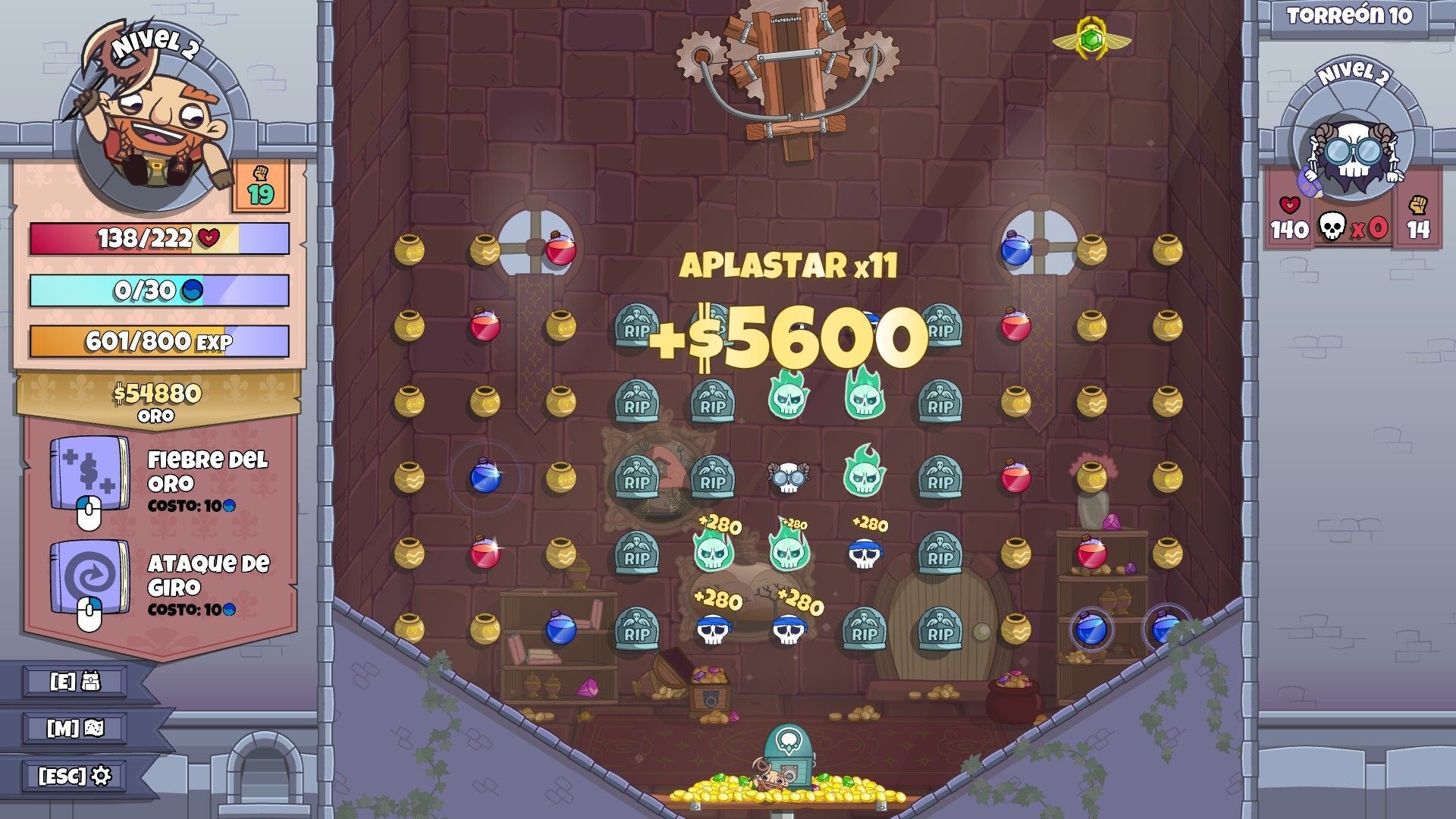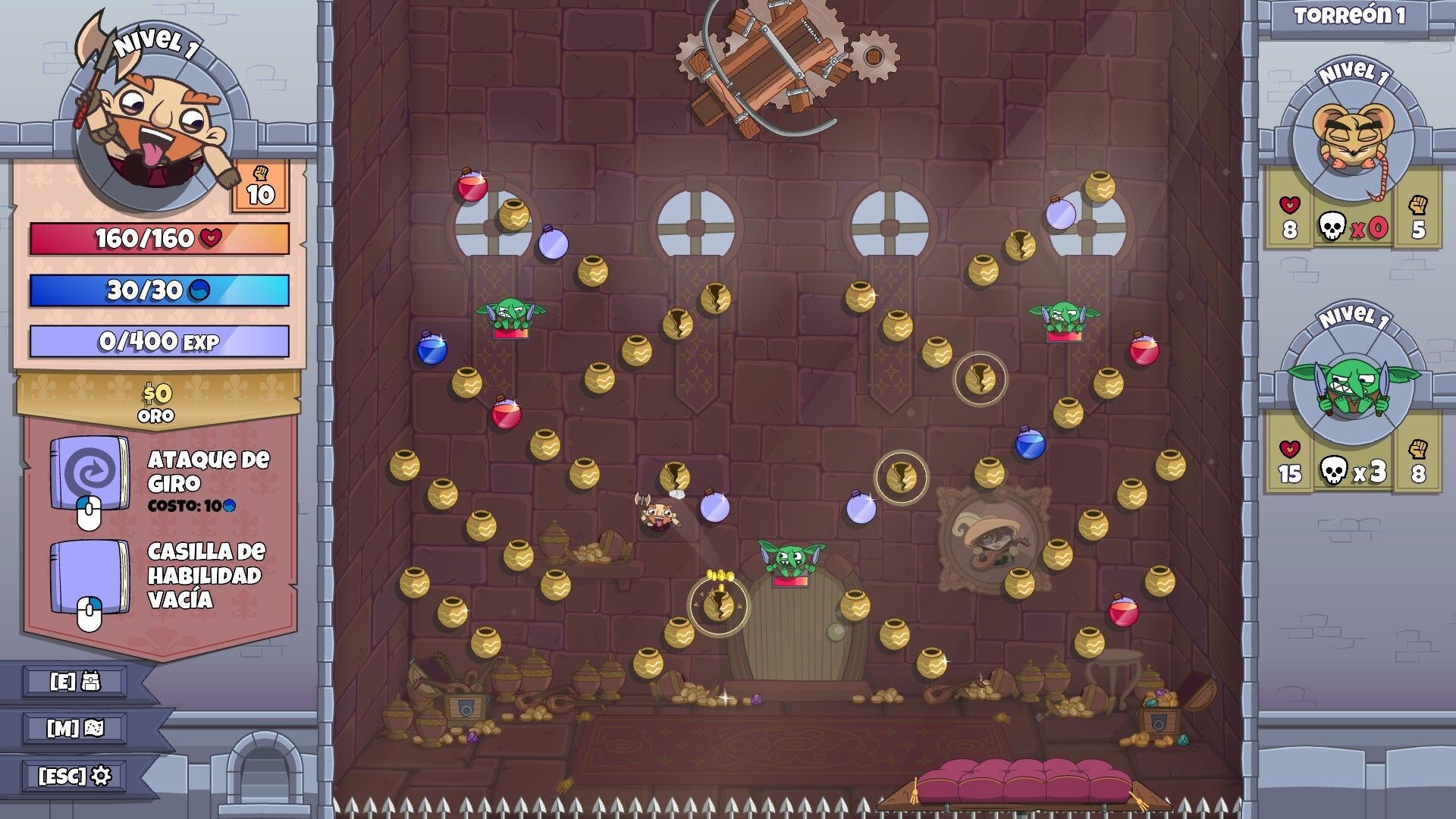 Pero el guerrero, la hechicera o la indomable también se diferencian por sus habilidades iniciales, y además a medida que progresamos conseguiremos nuevo equipamiento que mejora la salud o el ataque –armas-, así como técnicas que consumen puntos de magia con varios efectos. Flagon puede debilitar a realizar un giro en 360º que ataca a enemigos dentro de su área, Shade tiene salto doble para corregir trayectorias y Fizz utiliza un relámpago. Así pues, al Peggle que ya conocemos se le añaden varias capas de personalización y aleatoriedad que lo hacen siempre fresco para que en una partida puedas, por ejemplo, añadir una habilidad que debilita enemigos cercanos.