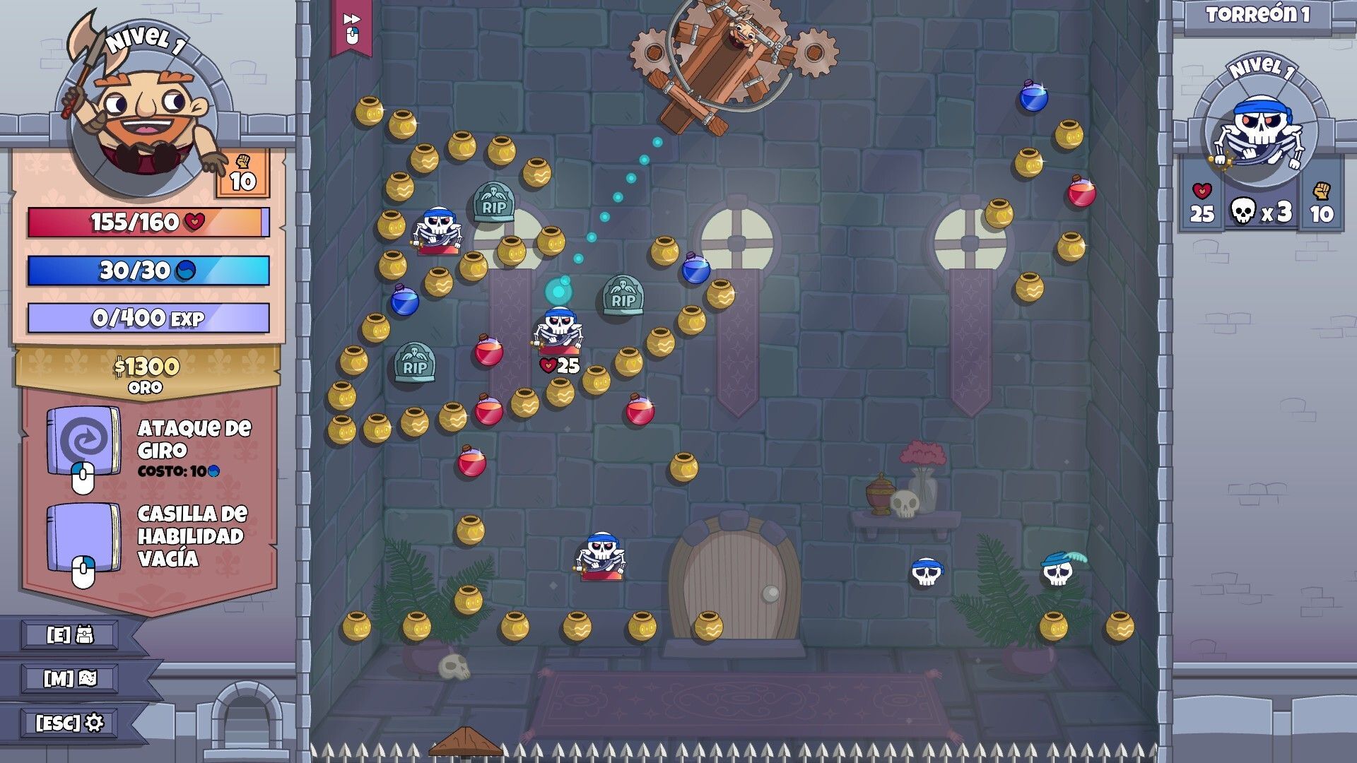 Quizás si lo describimos como un dungeon crawler con elementos de rol y pantallas aleatorias nuestra mente nos lleve al enésimo roguelite indie de vista superior, como tantos que se lanzan hoy día. Roundguard cumple esas mecánicas pero se inspira más en otros juegos como Peggle de PopCap, un juego que hoy no suena tanto pero en su momento sí gozó de éxito; a su vez, ese juego tenía rasgos del mítico Breakout. Por describirlo de manera rápida: disparamos algo –en este caso un personaje- desde la parte superior a una pantalla con vasijas, enemigos, pociones y más, dispersos en la pantalla, mientras el personaje rebota y rompe objetos o ataca a enemigos. Una especie de pinball donde hay que calcular bien el ángulo de lanzamiento, los rebotes que le seguirán y, por qué no, cruzar los dedos para que la suerte nos haga dañar al mayor número de enemigos y después caer sobre la zona segura de la parte inferior, que se mueve constantemente.