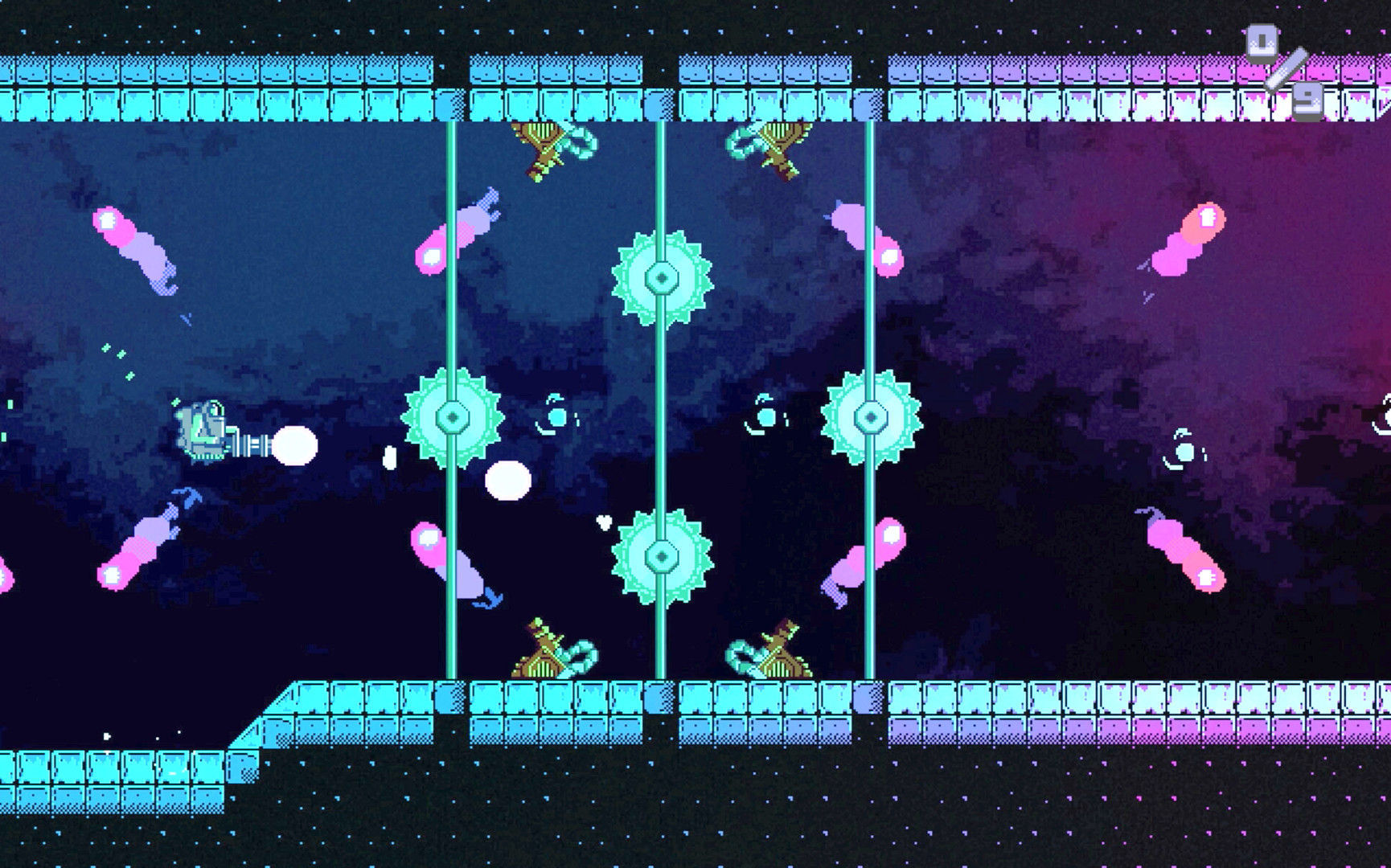 La mecánica se resume muy fácilmente: el personaje dispone de un gran cañón que al ser apuntado hacia abajo dispara; el retroceso hace que pueda flotar, por tanto manteniendo la ráfaga o soltando el botón durante un instante se ajusta la altura del vuelo. Lo comparamos antes con el célebre juego para móviles del pájaro en el sentido de realizar constantes correcciones para no golpear alguna trampa –pinchos, discos de sierra, chorros de fuego…- y esquivar disparos de torretas.