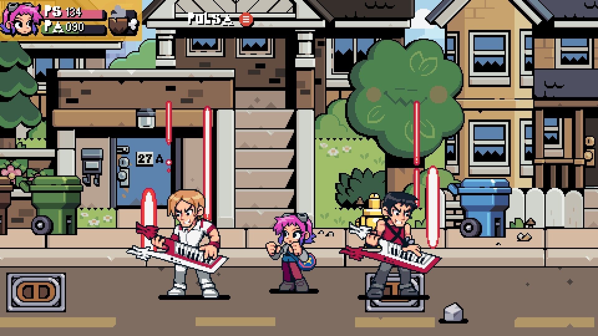 Por supuesto, los escenarios tienen montones de detalles, hay guiños al mundo de los videojuegos y a la cultura pop por todas partes que nos han sacado más de una sonrisa de complicidad y como fans de este universo y de este estilo gráfico mentiríamos si os dijésemos que no nos lo hemos pasado genial recorriendo esta alocada versión de Toronto mientras nos fijábamos en cada uno de sus píxeles. Y todo ello captando a la perfección los diseños de los cómics originales. Una maravilla que encima se ve reforzada por un par de filtros CRT simplemente perfectos que os recomendamos que activéis desde el menú de opciones.