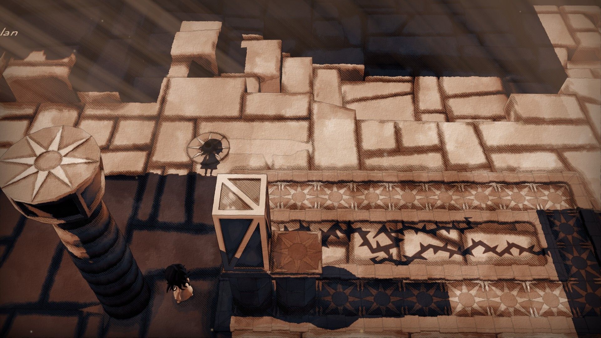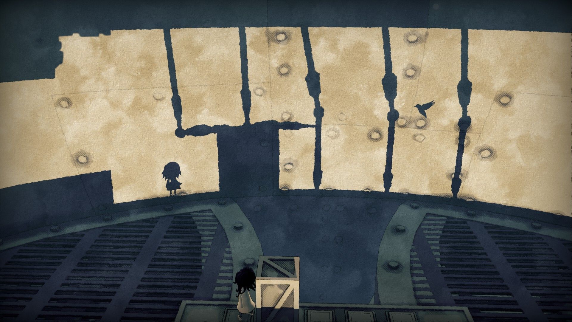 En general, los puzles son bastante sencillos. Con la chica tenemos que crear el camino de luz y sombras para que la silueta pueda avanzar, y con esta tenemos que generar un camino seguro de sombras para que la chica camine. Estos puzles suelen girar en torno organizar las «piezas» con las que jugamos, ya sean unas cajas, unas palancas o unos botones. Hay algunos muy, muy inteligentes, aunque la mayoría simplemente están bien; son correctos. Cumplen su cometido. Contamos, además, con un botón de rebobinado que podemos pulsar en cualquier momento para reintentar el puzle de nuevo y que nos parece genial. No es un juego en el que empezar desde cero si cometemos un error.