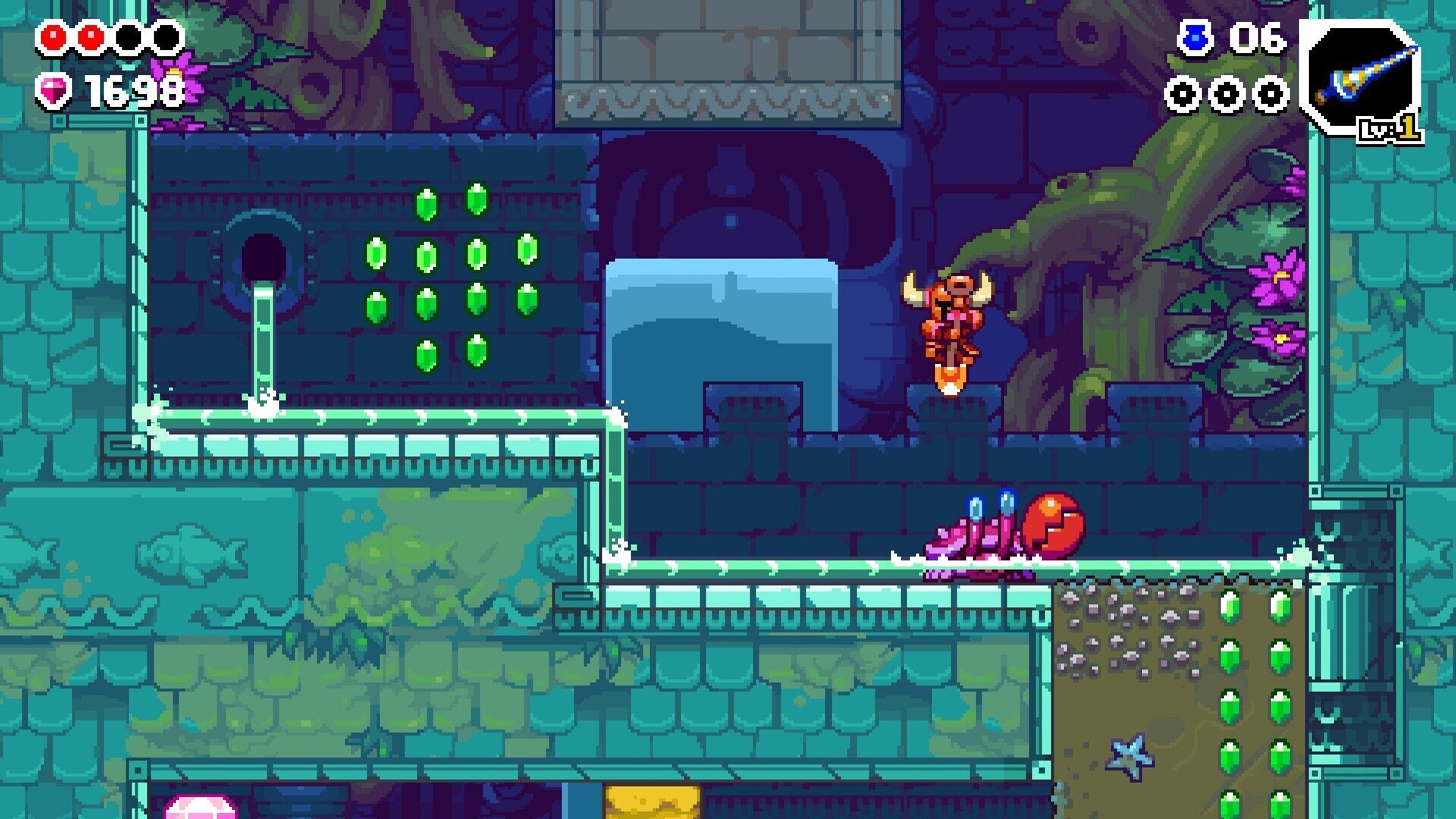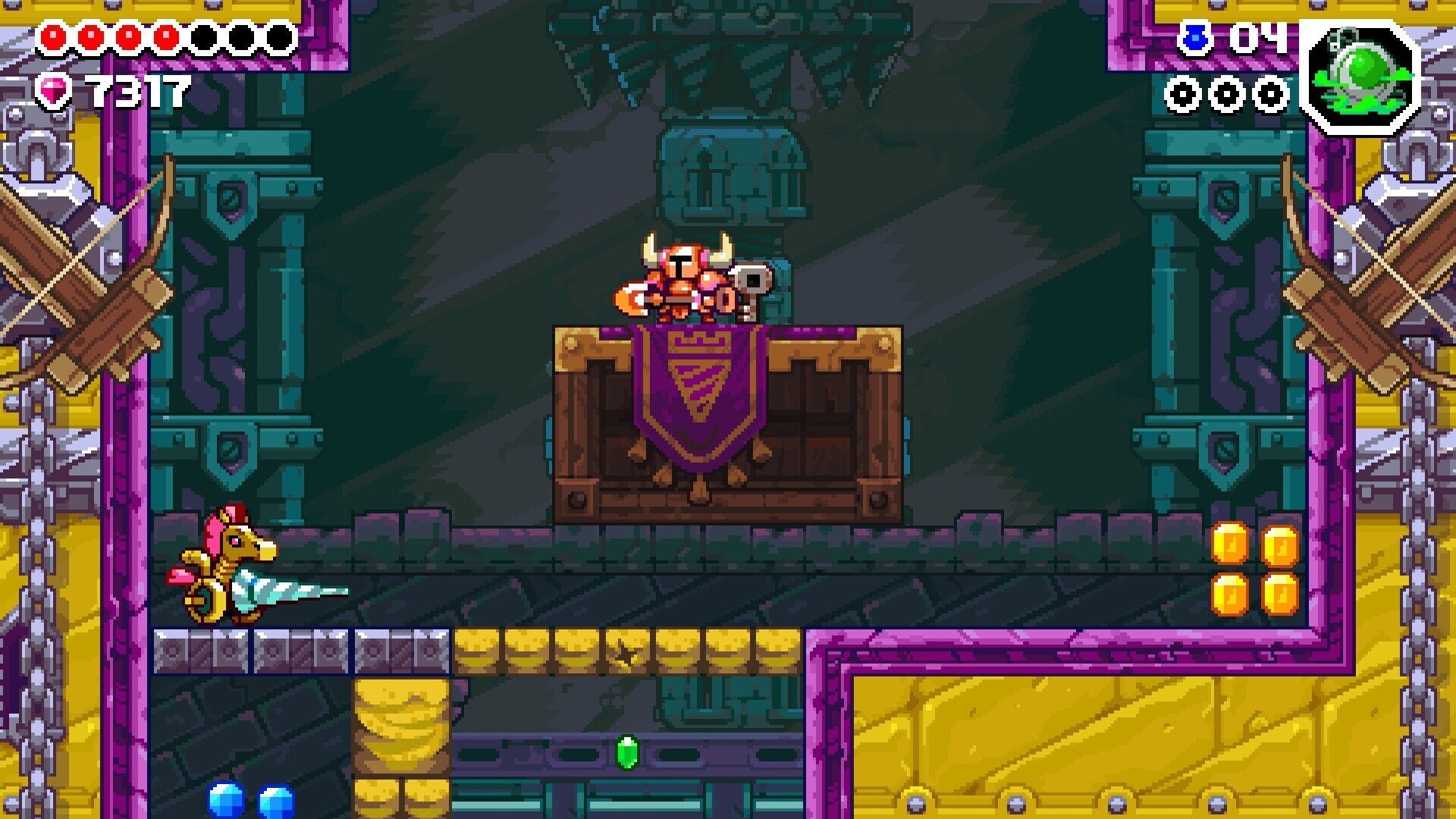 Si bien su estructura no difiere demasiado de lo que podemos encontrar en los cientos de roguelikes indies que inundan el mercado actual, donde realmente destaca Dig es en lo puramente jugable. Esto se debe, principalmente, al hecho de que a los mandos es muy similar a Shovel Knight, por lo que podremos atacar con nuestra pala, rebotar con ella sobre los enemigos y determinados elementos del escenario, cavar, saltar, encontrar montones de secretos ocultos en paredes sospechosas que no parecen encajar con el resto del escenario y usar todo tipo de reliquias para desatar hechizos y habilidades especiales. Sumadle que se han recuperado multitud de enemigos, trampas y obstáculos de la obra original y que no pararemos de recoger gemas e indagar en cofres del tesoro, y tendréis un juego muy familiar y con toda la esencia de la serie.