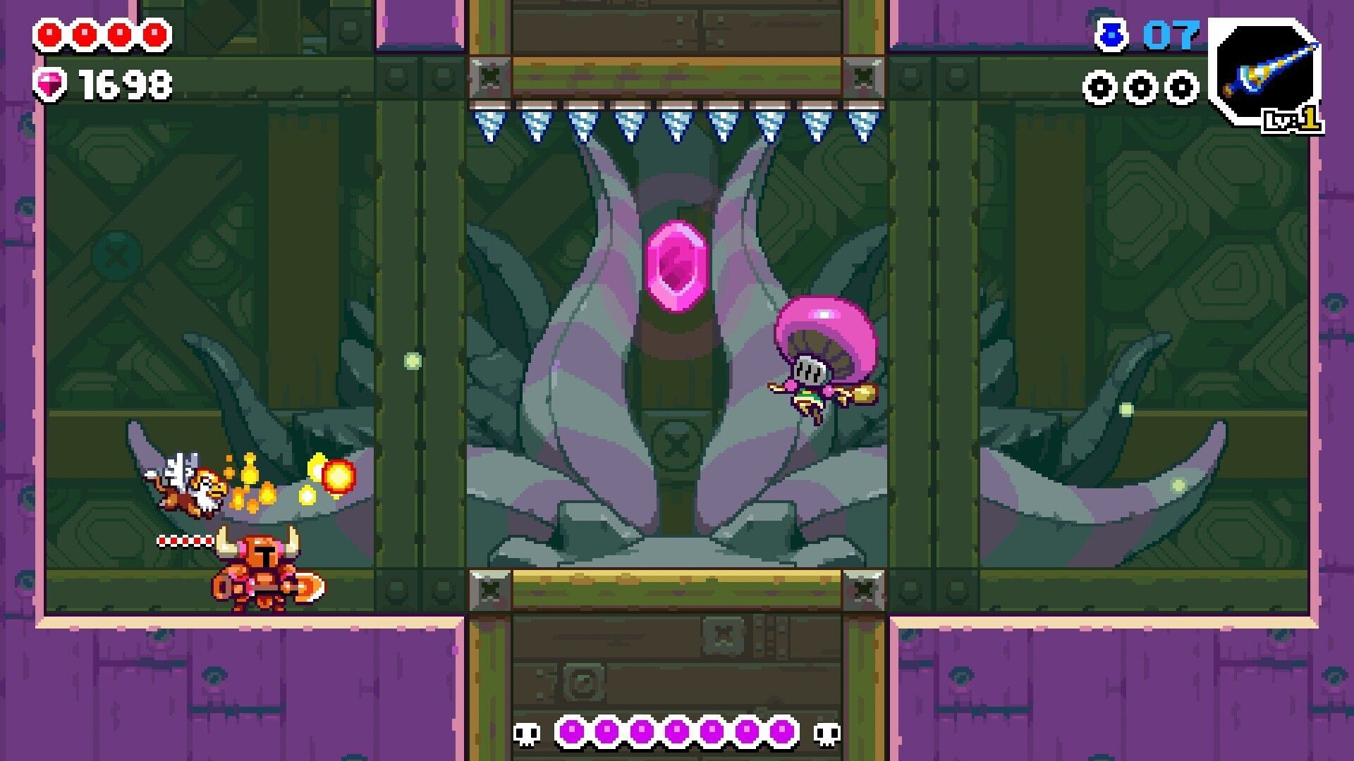 Algo que también ayuda a que Shovel Knight Dig funcione tan bien reside en el control que nos suele dar en cada partida al permitirnos decidir casi siempre entre dos caminos distintos cada vez que terminamos una pantalla. Mediante unos sencillos carteles, siempre nos indicarán qué es lo que nos vamos a encontrar en cada ruta, como una mayor presencia de un determinado tipo de trampas o un personaje con el que comerciar, así que podremos escoger los retos a los que nos querremos enfrentar. Además, hay varios momentos en los que podremos elegir si ir a un bioma u otro, cada uno con sus propias peculiaridades que podrían beneficiarnos más o menos según el equipo que hayamos conseguido durante la partida.