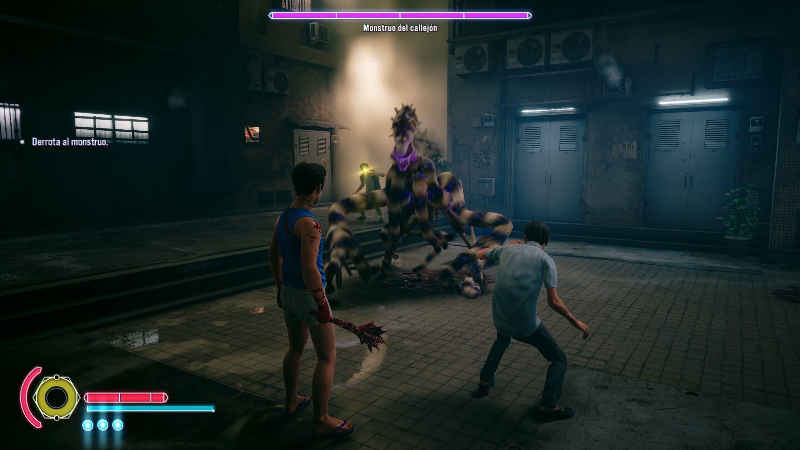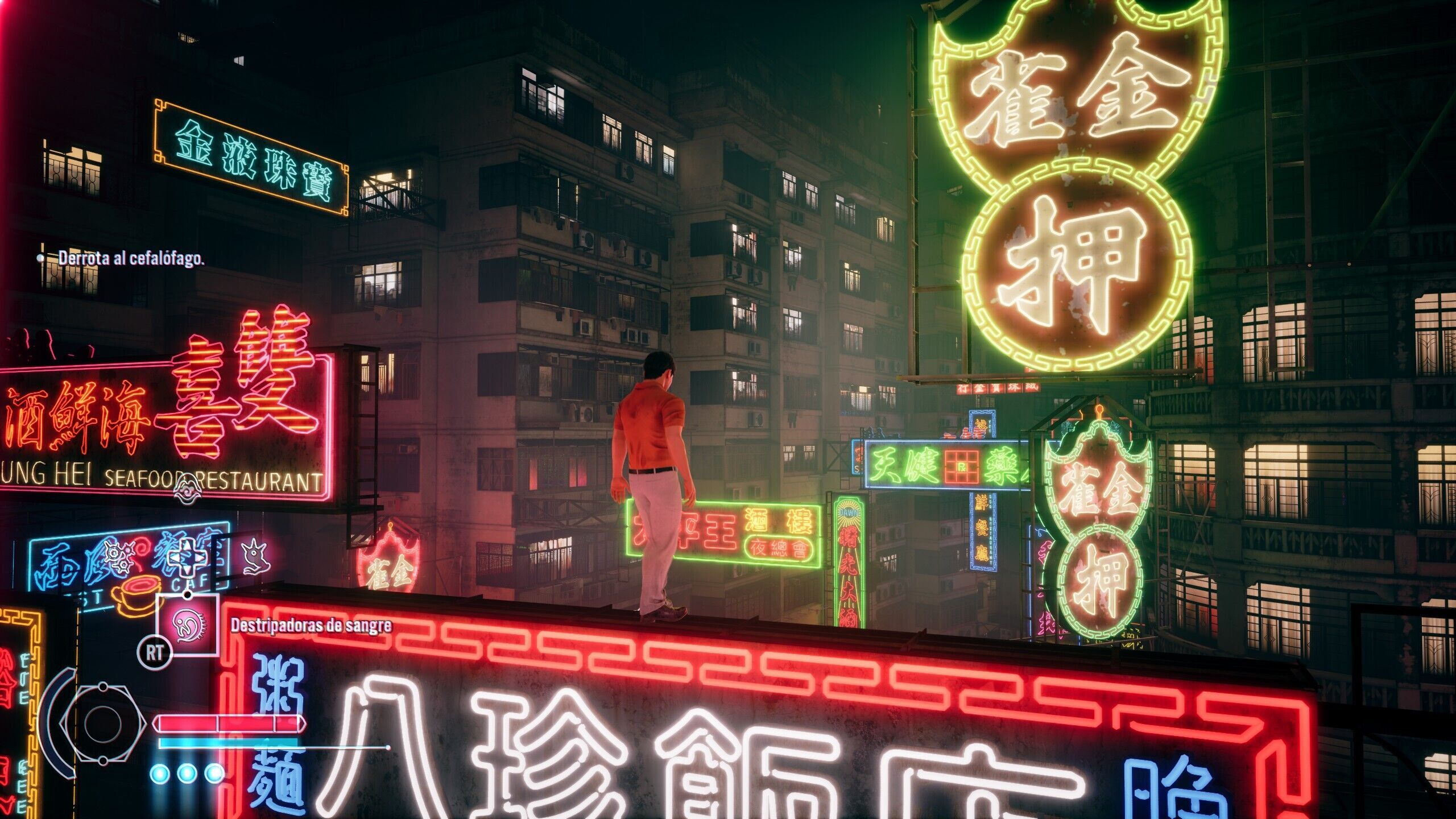 Slitterhead se compone de una serie de misiones, algunas que tienen lugar por la vertical Kowloon y otras en escenarios lineales, donde lo principal son los combates. Sí, hay alguna secuencia de sigilo sin mucha chicha pero curiosa al estar sustentada en ir saltando constantemente entre individuos que poseer; además de persecuciones por los callejones, tejados y carteles de neón de la ciudad, donde también es fundamental introducirse en los habitantes para alcanzar rápidamente a nuestra presa y salvar distancias imposibles de saltar, todo ello mientras esquivamos las cajas, barriles y otros elementos de los entornos con los que el perseguido trata de frenarnos, algo que al principio es atractivo y original, pero que no tarda en perder fuelle.
