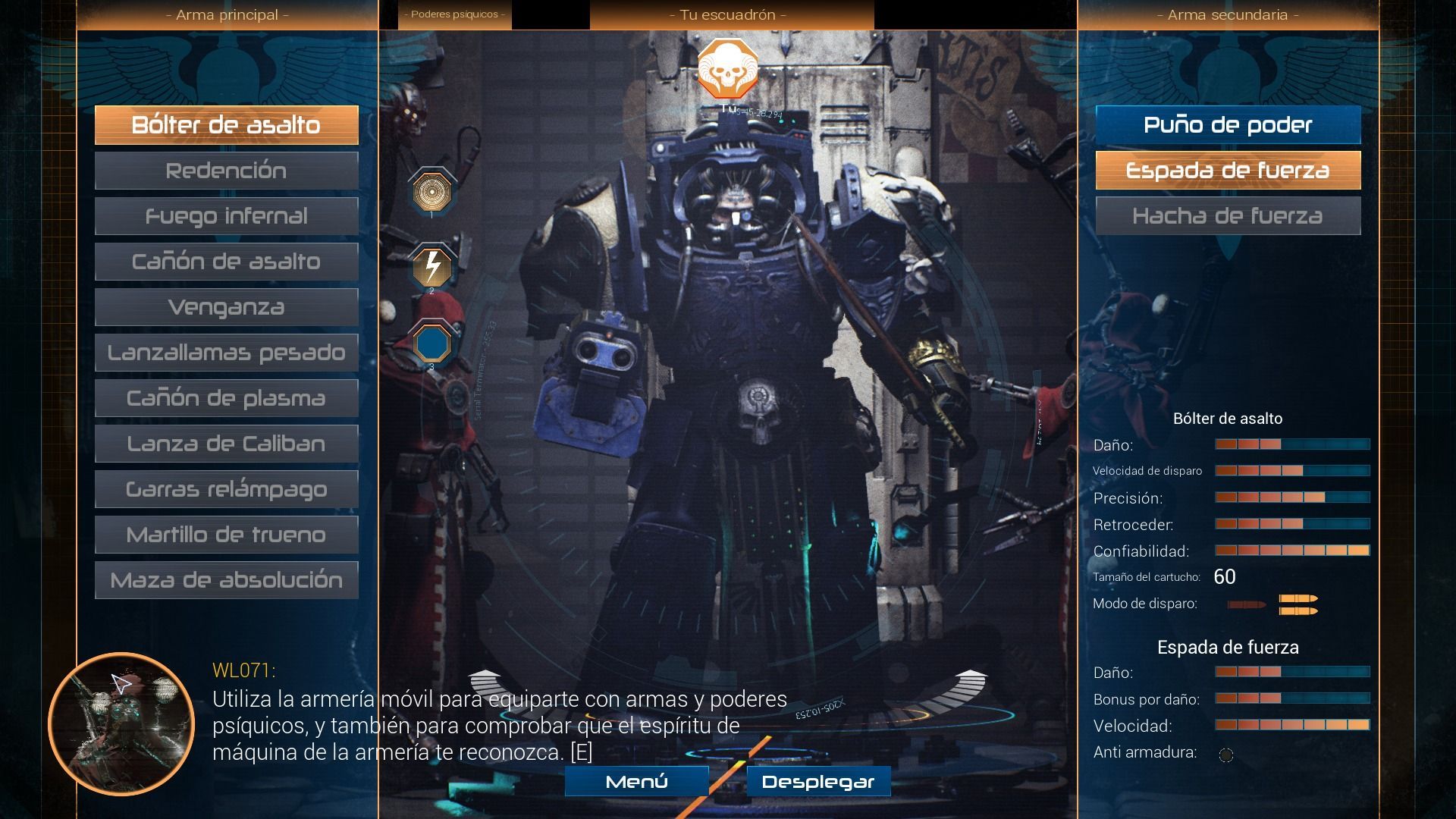Para conseguir que seamos un auténtico equipo de aniquilación perfectamente coordinado, Space Hulk nos permite elegir entre varias armas y habilidades psíquicas. Dentro de las armas principales encontraremos una ametralladora pesada, un lanzallamas o, entre otras muchas opciones, un rifle de asalto. Por su parte, las armas secundarias estarán destinadas a los ataques cuerpo a cuerpo y, dependiendo del arma principal, podremos elegir entre espadas, mazas o, por ejemplo, garras metálicas. Inicialmente dispondremos de un reducido número de estas armas, pero a medida que vayamos completando objetivos iremos aumentando nuestro arsenal y las posibles combinaciones con nuestros aliados. A nivel jugable las armas principales están bien compensadas y ofrecen variedad, algo menos evidente en las armas cuerpo a cuerpo debido a su parecida efectividad y poco práctico sistema de ataque.