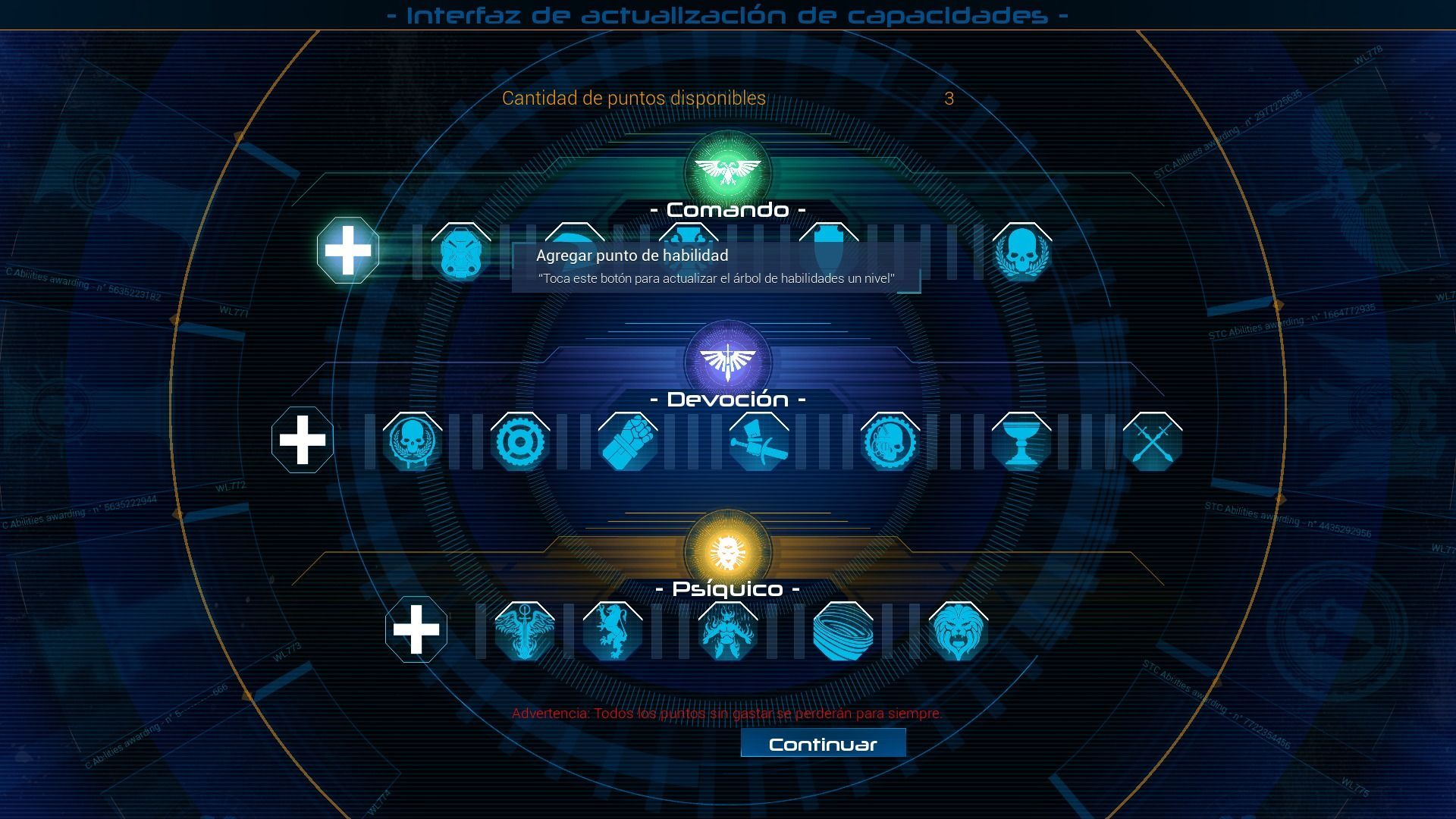 Space Hulk: Deathwing ofrece un árbol de habilidades con tres ramas diferentes. La primera de ellas está destinada a los poderes Psíquicos, por lo que será aquí donde podremos desbloquear nuevos ataques cada vez más devastadores y asignarlos a las ranuras disponibles. La segunda sección corresponde a la Devoción, por lo que podremos potenciar las habilidades de nuestro personaje aumentando su fuerza o, por ejemplo, mejorando su rapidez de pirateo. Por último, la rama Comando nos permite mejorar las habilidades de nuestro escuadrón para ser un equipo más efectivo. Sin duda, aunque el árbol de habilidades es poco extenso y solo podremos mejorarlo al final de los capítulos, ofrece mejoras interesantes para adaptarlo a nuestro estilo de juego.