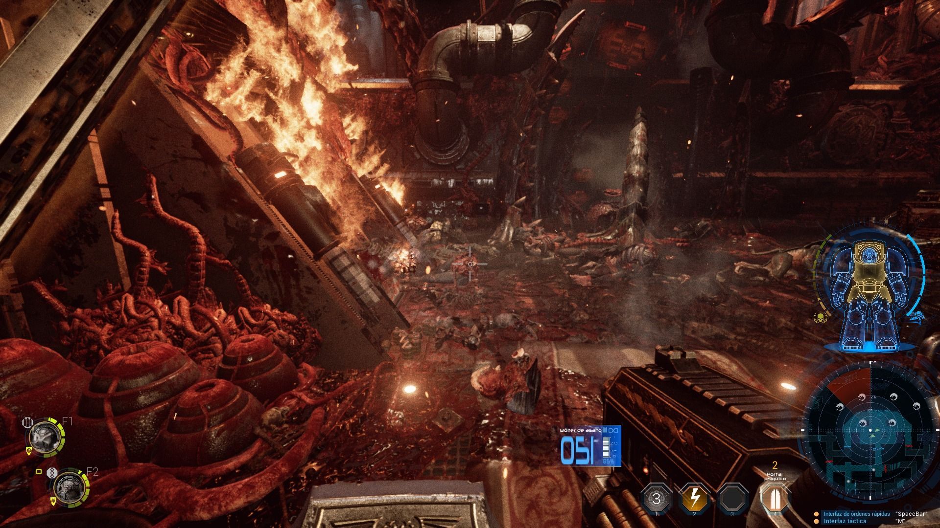 Adentrándonos en los elementos jugables, una de las características más llamativas de Space Hulk es que ofrece la posibilidad de disfrutar de toda la aventura con cuatro jugadores online. Gracias a esto podremos elegir si jugar en solitario, con dos personajes controlados por la IA, o disfrutar con otros tres amigos online. Esta opción, lejos de ser un simple añadido, se ha integrado bien con las mecánicas de juego y podremos dar órdenes a nuestros compañeros para crear pequeñas estrategias de avance y ataque. Para ello, contamos con un menú circular de selección que nos permitirá dar órdenes de acompañamiento, defensa o curación. Estos comandos son muy efectivos y, aunque en la variante online las posibilidades estratégicas aumentan y existe un mayor dinamismo, la opción en solitario sigue siendo divertida.