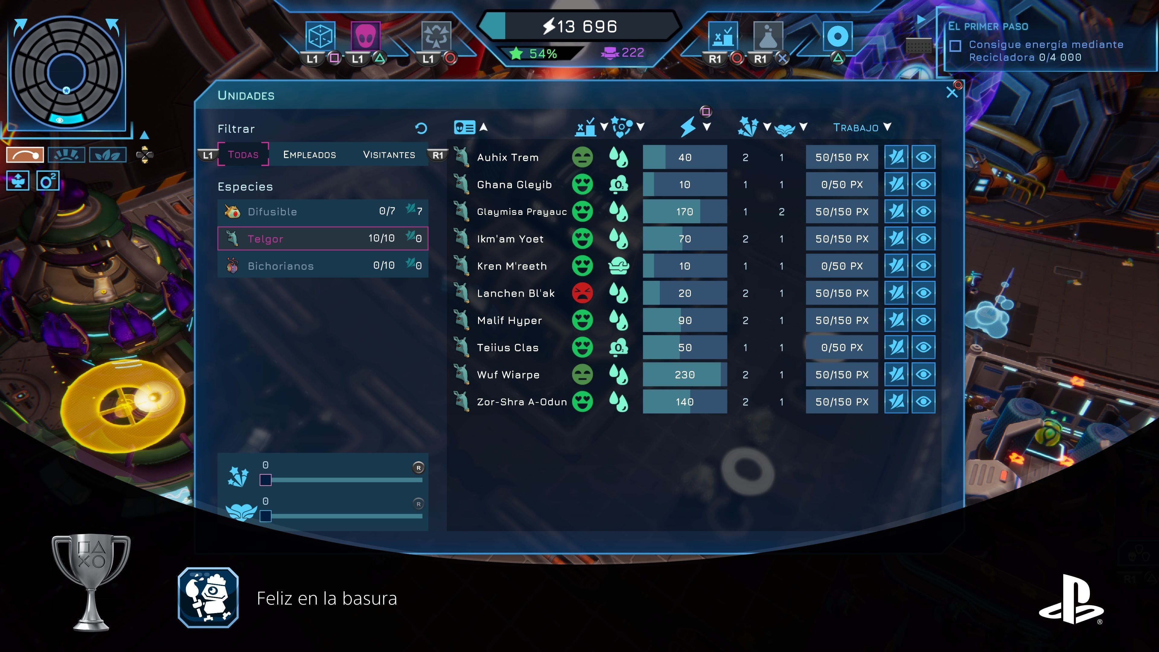 Lo más destacable de Spacebase Startopia, y quizás lo que nos ha hecho seguir jugando sin parar, es el tono de humor que impregna todo. Es un videojuego tremendamente cachondo, con un exquisito doblaje al español -está muy bien traducido, además a nivel de texto-, con una inteligencia artificial irónica y sarcástica que nos acompañará haciéndonos críticas a todos y cada uno de nuestros movimientos y decisiones, al que hay que sumarle además muy buenos diseños en términos de especies extraterrestres y entornos. La estación especial está recreada en 3D -en PS5 y Xbox Series X/S ofrece resolución 4K nativa, así como rendimiento y efectos visuales mejorados-, con ambientes diversos, y pese a que en consola desplazarse en detalle con la cámara libre puede traernos alguna que otra palabrota a la boca, merece la pena observar los numerosos detalles y animaciones de los alienígenas que se mueven por ella. No hay que olvidar que, más allá de tener un ojo en la Energía -la moneda del juego y lo que lo mueve absolutamente todo-, tenemos que prestar atención a la felicidad de nuestros visitantes y huéspedes. Requiere de esfuerzo y constancia hacer que estén contentos todo el rato, pero cuando los veamos mover el esqueleto o tomarse algo en una de nuestras instalaciones con una sonrisa en la cara, seremos conscientes de que algo hemos hecho bien. Y sonreiremos con ellos.