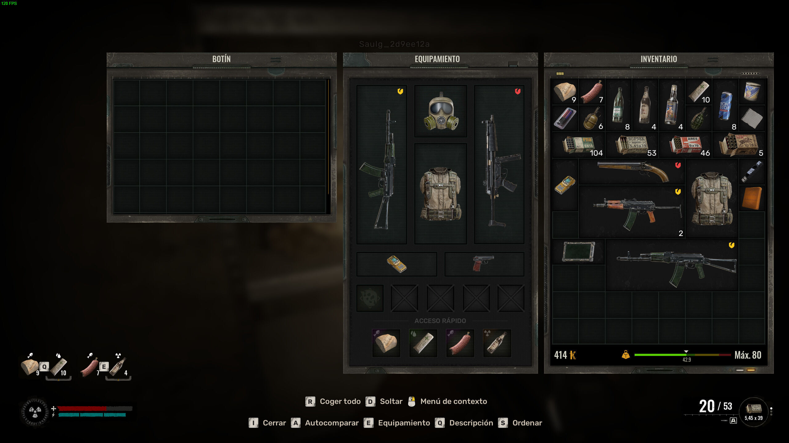 En S.T.A.L.K.E.R. 2 tenemos que vigilar no solo nuestra vida (escogiendo entre botiquines o vendas para curarla en función de nuestras heridas o si tenemos una heorragia) sino que también tenemos que comer para saciar nuestro hambre, beber agua o una bebida energética para recuperar resistencia y saltar o correr rápido (aunque al principio quizás no lo uséis tanto a medida que pasa la partida vais a acabar utilizando estas bebidas).