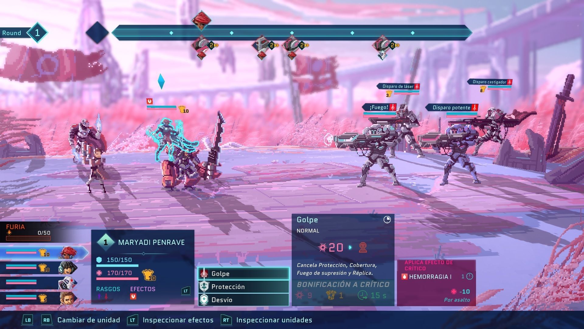 Esto sería, más o menos, la esencia del juego, pero tenemos que hablar del combate por turnos. Como títulos juegos del estilo, tiene una barra de tiempos en donde se posicionarán los diferentes movimientos que hagamos, pero como aspecto peculiar desde el inicio de cada turno sabremos exactamente cuál es el plan de los enemigos. Así, podremos, por ejemplo, usar un ataque que retrase un movimiento enemigo, mejorar las estadísticas de uno de nuestros personajes, y entonces soltarle nuestro mejor ataque, algo que de otra manera hubiera sido imposible.Como aspectos relevantes, cada personaje cuenta con vida, escudos y blindaje, de manera que no sólo tenemos que estar atentos a una barra de vida, hay una barra de furia que va subiendo conforme avance el combate, que nos permite realizar determinados movimientos, y conforme avance la partida conoceremos también las debilidades de cada enemigo respecto a nuestros movimientos, lo que resulta muy útil para derrotarlos posteriormente.