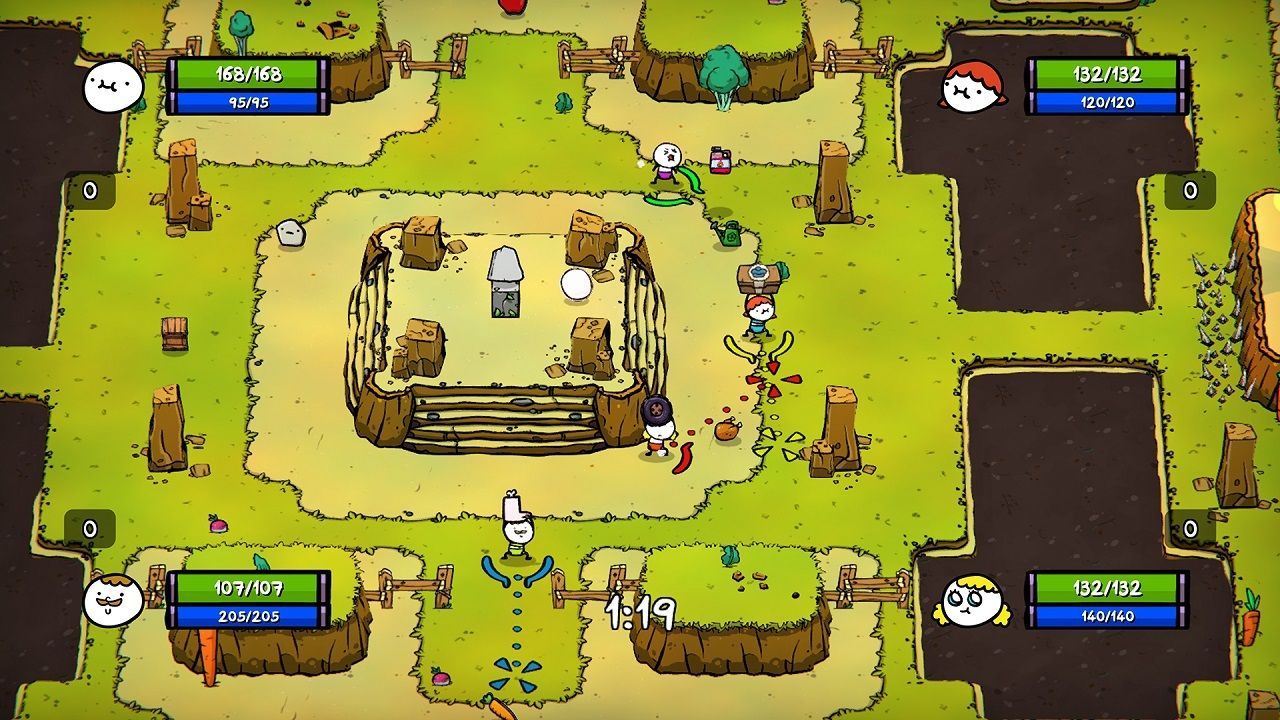 Para otorgar más gracia a este sistema, es cierto que es posible llegar a recoger y lanzar casi dos centenares de objetos únicos. Y como podéis imaginar, cada uno de ellos posee sus propias características puesto que no es lo mismo lanzar una bomba que una roca o un mero cubo de basura. Prácticamente todo lo que aparece en los escenarios, incluyendo los propios cofres de tesoros, son susceptibles de ser devorados por los protagonistas… una acción que tiene su aquél. Eso es, porque en función de las cualidades o particularidades del objeto en sí los personajes ganan salud, la pierden o son dotados de estados beneficiosos temporales.