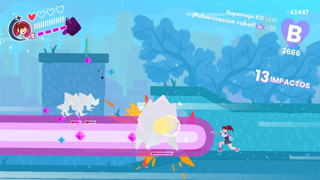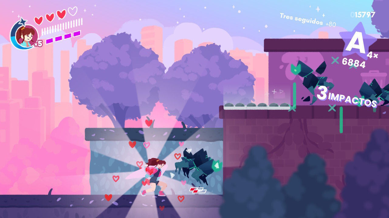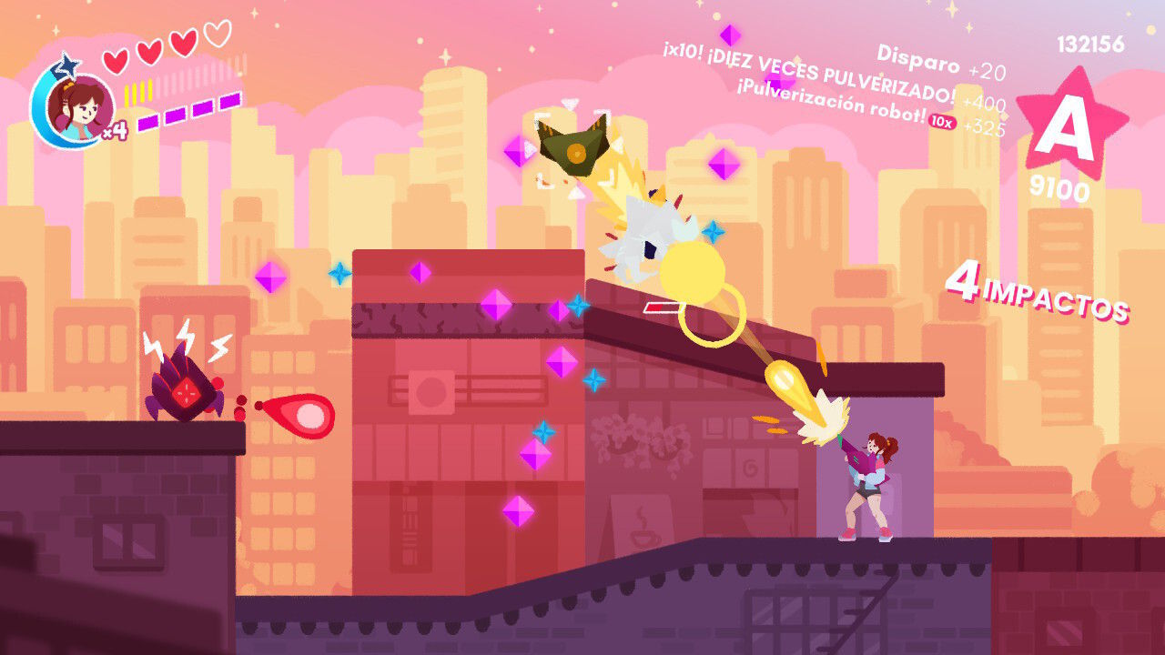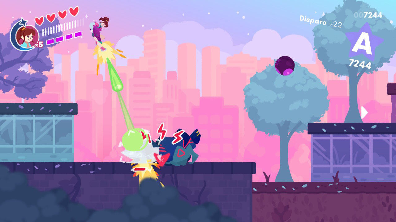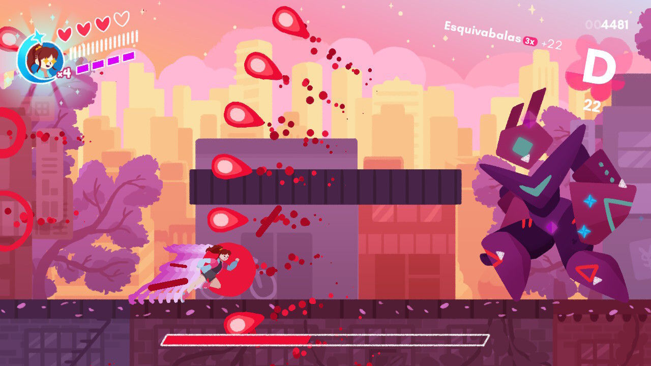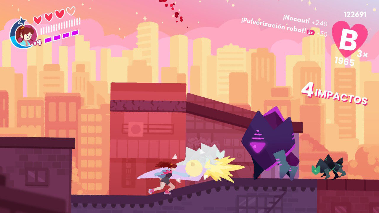 Con estas posibilidades y el amplio rango de movimientos a nuestra disposición, el título nos anima a ir despachando a nuestros adversarios de las formas más espectaculares que nos sea posible. A poco que practiquemos un poco y tengamos facilidad para dominar el sistema de control podemos llegar a realizar combos de rango S tremendamente llamativos, siendo precisamente esta actividad el aspecto que aporta más vida y chispa a la jugabilidad. En cierta forma y para que os hagáis una idea, estamos ante una especie de hack’n slash que recuerda un tanto a los combates vividos en clásicos del género como Devil May Cry o Bayonetta, si bien es este caso la jugabilidad es en 2D y su disposición es bastante más básica… y desenfadada.