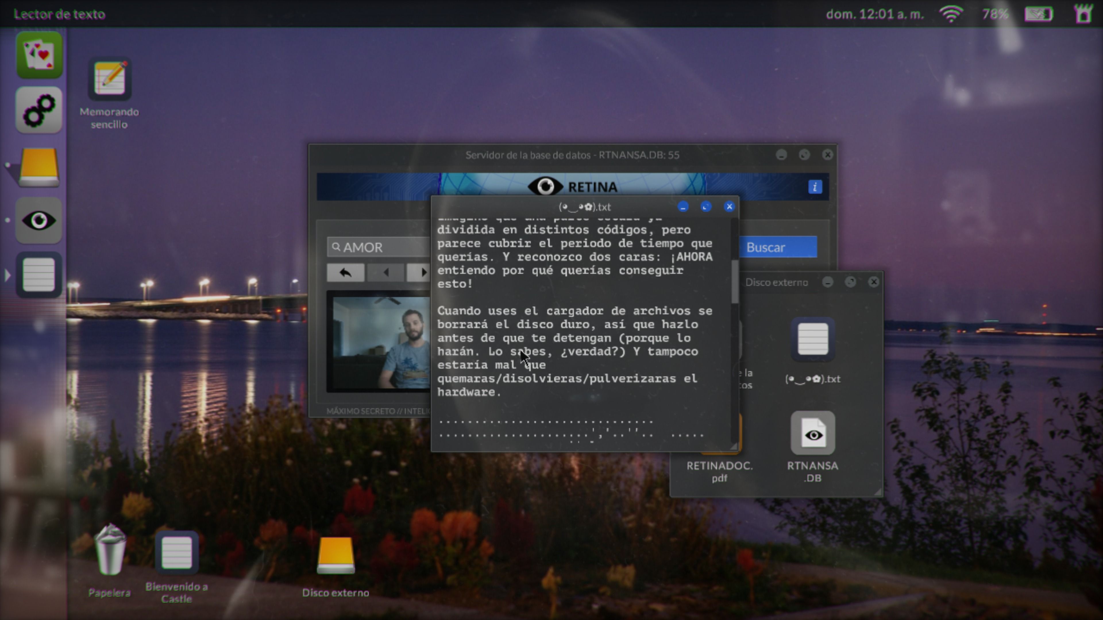Los vídeos, según parece, han sido robados con cámaras ocultas e interceptando videollamadas. No sabemos qué está pasando. Unos vídeos nos muestran a un agente del FBI, otros a una familia en el parque, a una chica que ofrece videollamadas eróticas por internet, o a un grupo de jóvenes con mala pinta en un coche. El nexo de unión, la razón por la que tenemos acceso a esos vídeos o qué estamos intentando averiguar es totalmente un misterio.