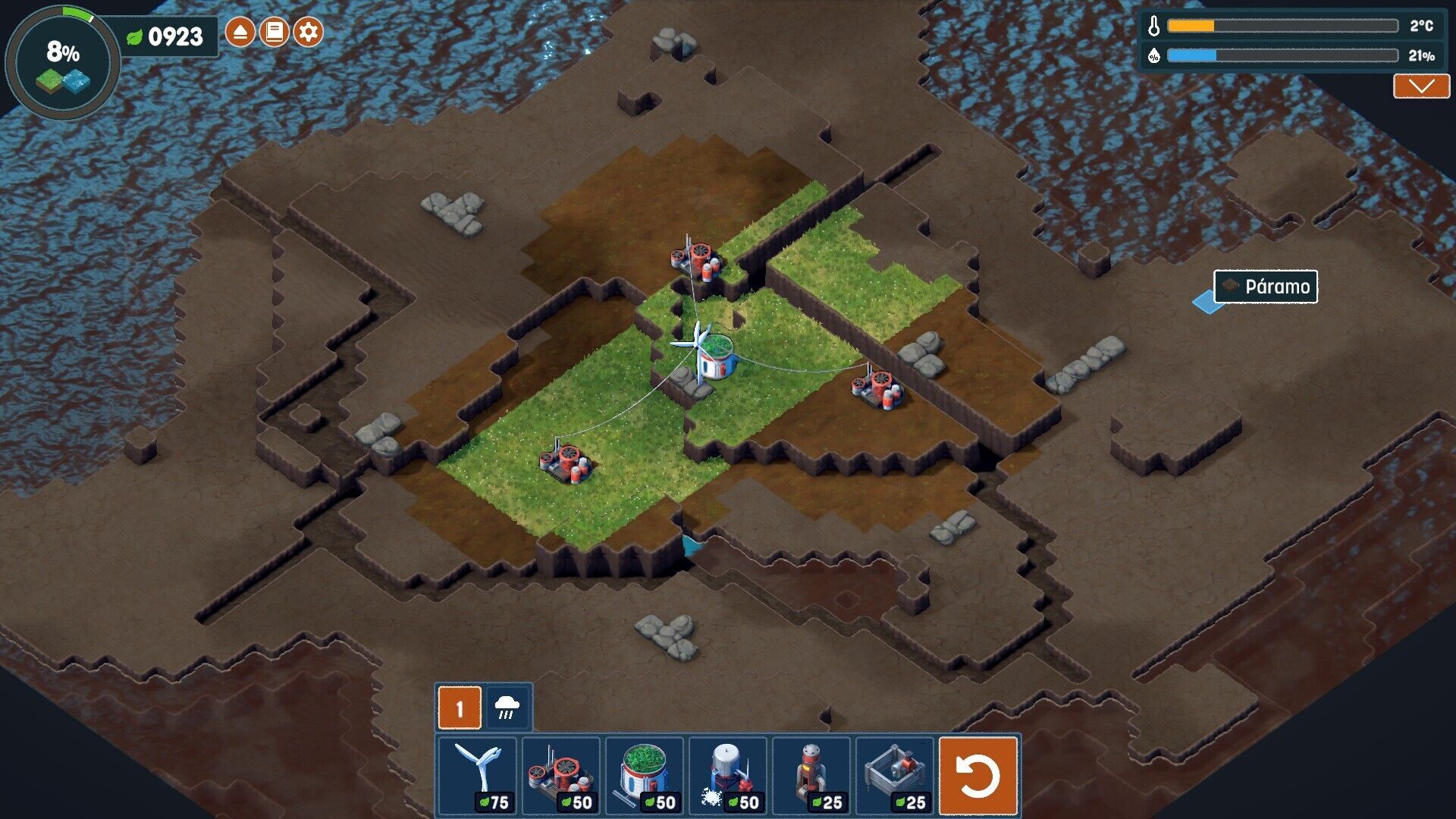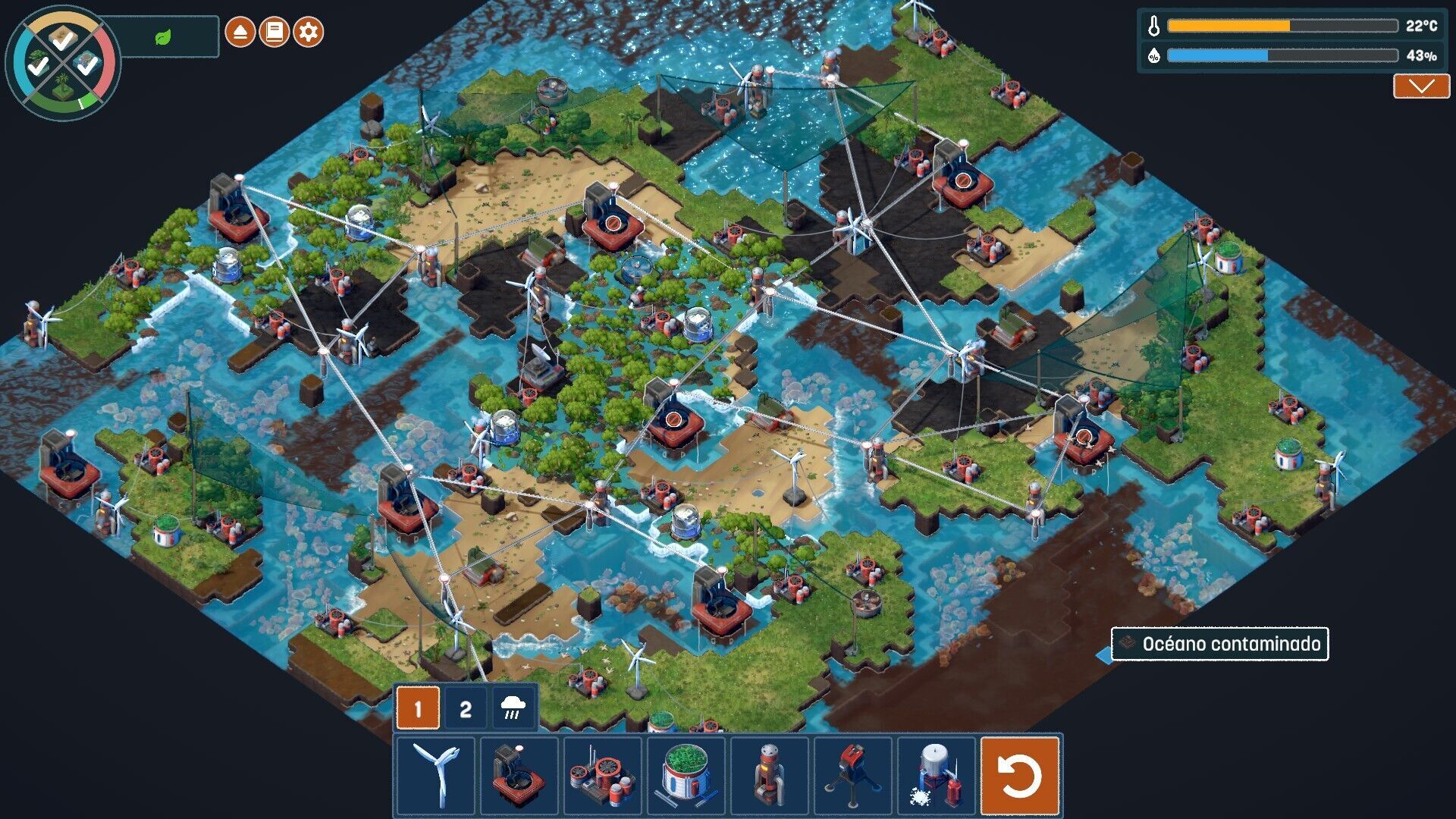 Cuando esto es problema nuestro no queda otra que resignarse, pero cuando se produce una situación de atasco por culpa del juego llega a ser molesto. Entendemos que Terra Nil no podría ser como es sin la generación procedimental de escenarios, pero también hemos de decir que este sistema le juega malas pasadas a la experiencia: puede que con las casillas generadas no haya hueco para completar el porcentaje de un bioma que nos han marcado como objetivo, pero de eso sólo nos daremos cuenta cuando llevemos un buen rato dando forma al nivel. Reiniciarlo en ese momento es un fastidio, pero no nos quedará otra que empezar de nuevo o incluso buscar una nueva semilla de escenario, porque se crean situaciones de callejón sin salida.